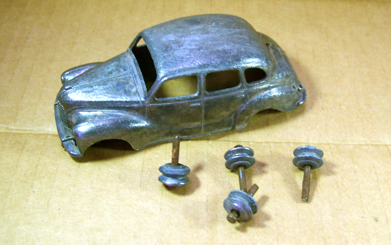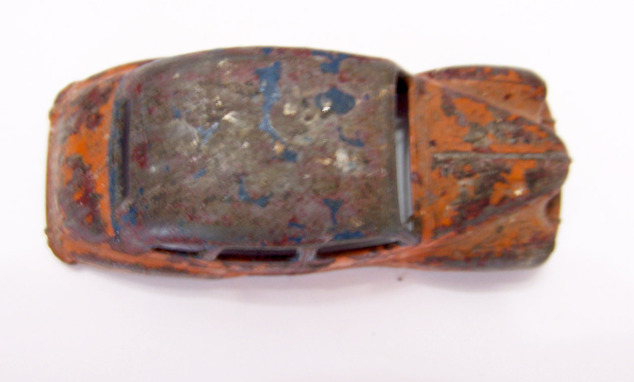 Rusty, overpainted more than once but solid model. The chassis was soaked in vinegar overnight and the result is surprisingly good with most lettering visible. Original colour maroon as seen on the inside. Corrosion to the bodywork mostly covered by two coats of primer, but still a few blemishes.