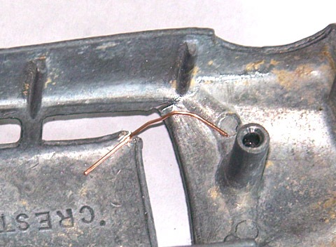 Chassis removed, paint stripped and note the repair to the windscreen pillar. Groves were cut where the pillar was attached and a small wire (telephone wire) was shaped and held in place with metal based epoxy resin. The wire is there to reinforce the repair and gives something to hang the epoxy resin on. Several coats are applied and left to dry overnight before filing into shape.