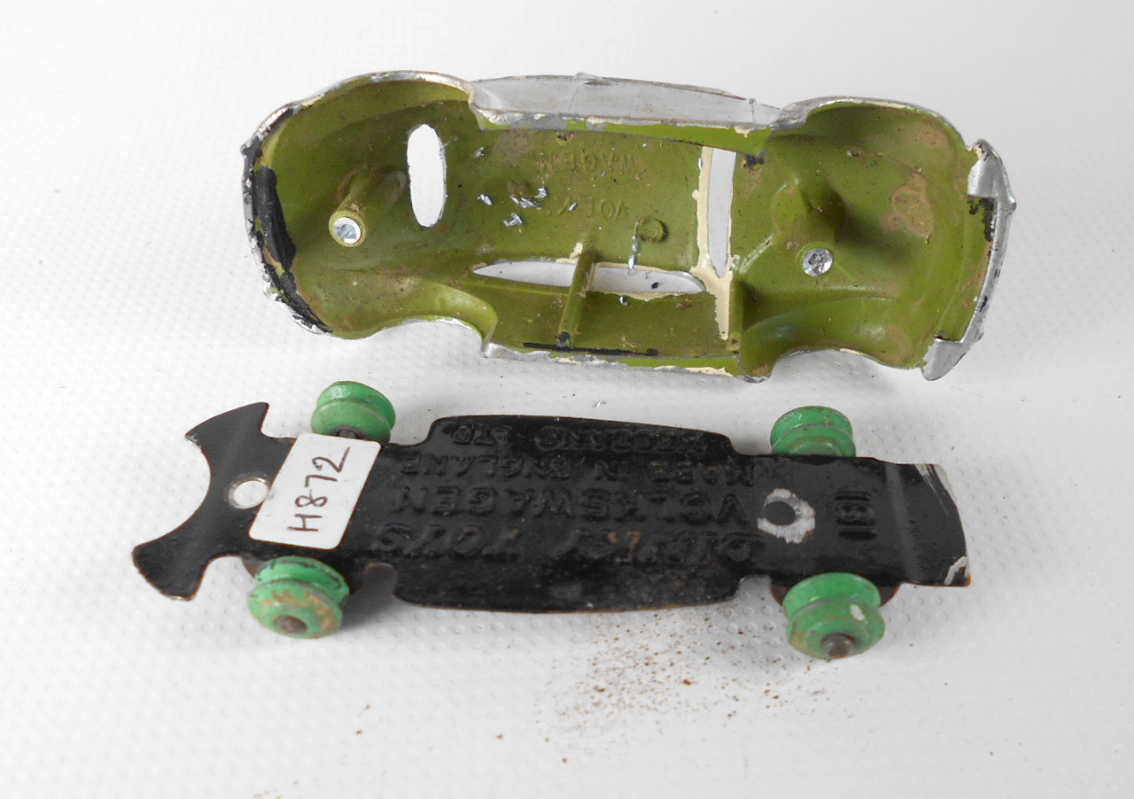 This silver painted VW was an early Dinky. I tried to remove the silver paint only using mild chemical stripper but it softened the original green paint. Later Dinky models had a hard baked paint that ould have resisted the stripper. So nice try but this now goes for a complete strip and repaint.