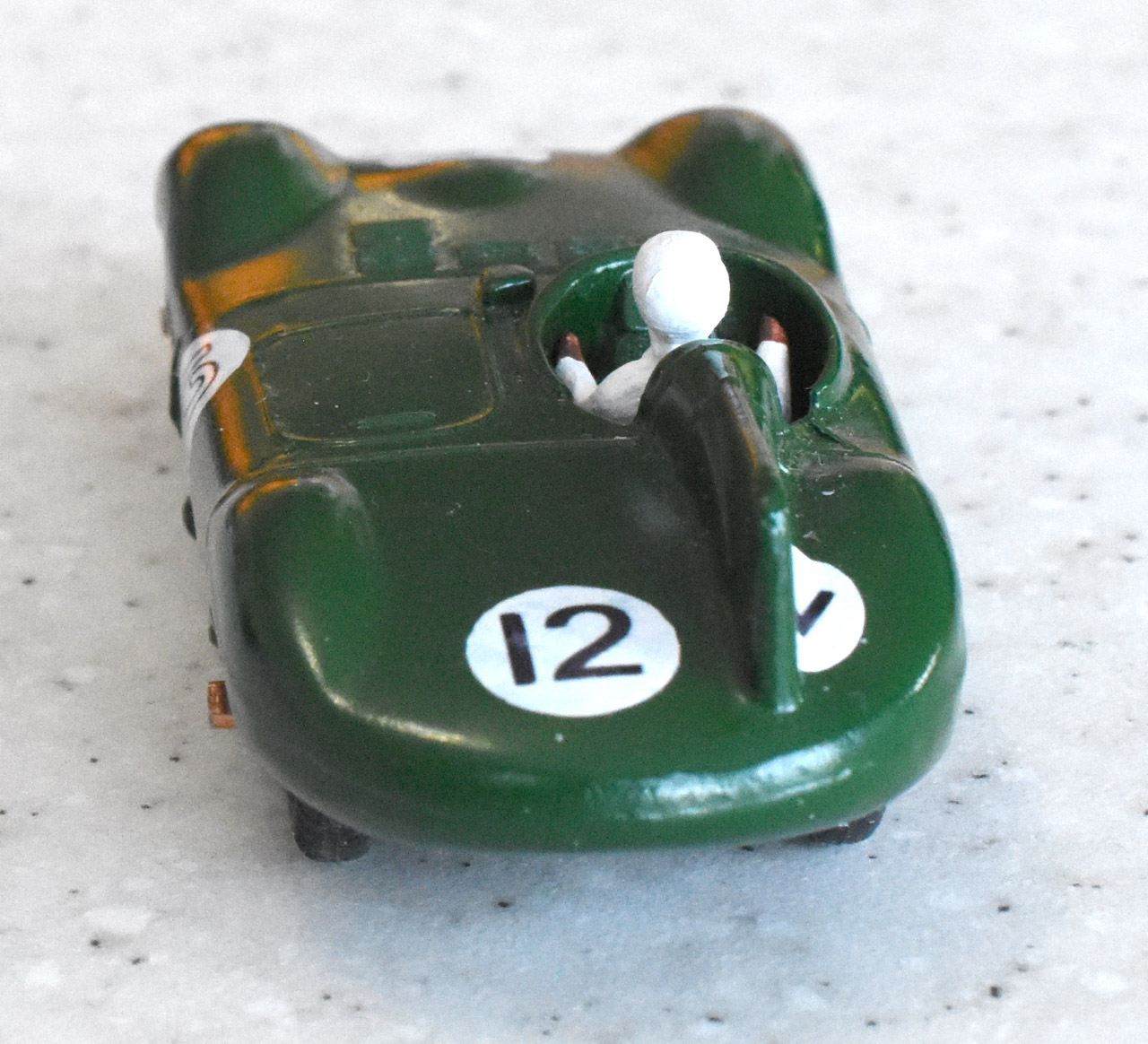 Undergoing Restoration The chassis was buckled and one of the blue plastic wheels was cracked and all loose on the axles and no steering wheel. A full strip down was done, removing the hubs and axles. Paint stripped and chassis straightened photography picks out blemishes too well but we will see after paint is applied. I finished this with numbers as on the Stirling Moss Jaguar. Box to follow.