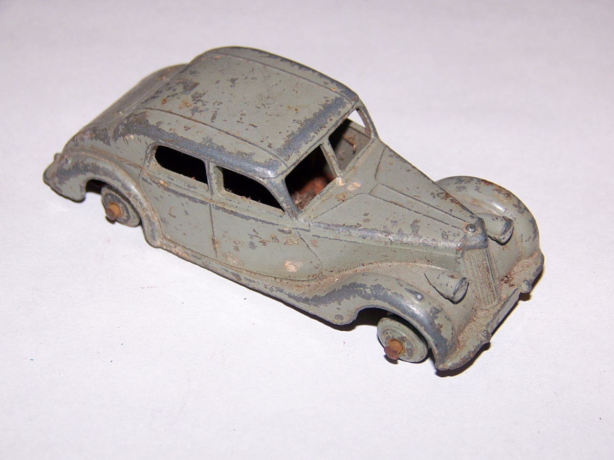 i guess this one was dipped in old paint, what a mess, but otherwise an intact model. Following the same routine of stripping repairing and re-spraying I decided to finish this in burgundy. I already have one in the standard cream finish and if it ever were necessary to revert back to the original color it would be easy to do so. I think the new color to be quite a good choice for this particular model. Made by Dinky 1947-1960 this one 1950-1952.