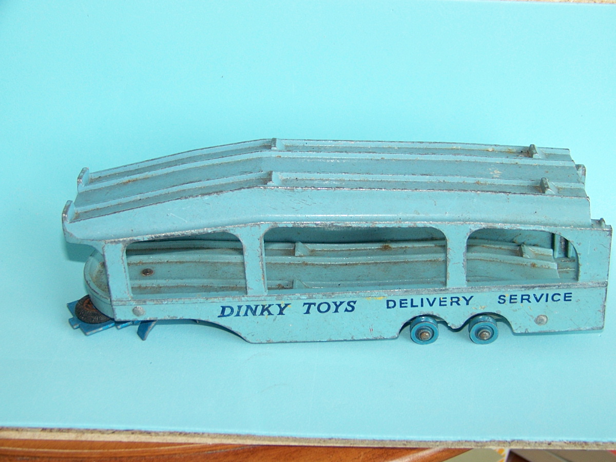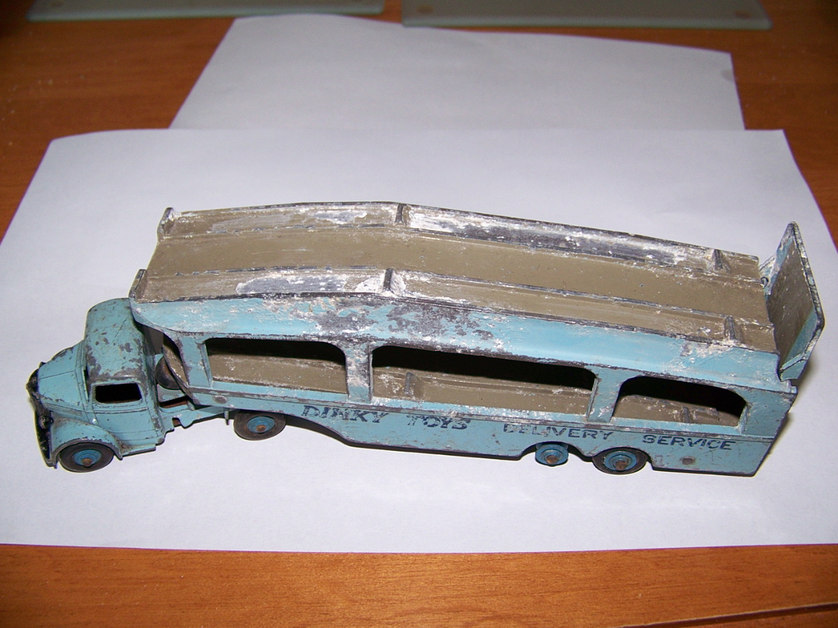 A rough example and well worth restoring. Missing ramp, one headlight, bent axles, rusty chassis, and some corrosion, so not too much to do. Strip down could have been simpler as I assumed the rivets holding the upper trailer body to the lower were in fact rivets. I believe that they are studs in the lower part and the upper is opened up over them to assemble. This was a possible way to undo the parts but it may leave the upper part a little bent. The studs were drilled out using a 1/8th drill. I then drilled further to provide sockets for replacement studs. The cab unit was separated by grinding the rivet top off from the lower unit and punching out. The grille tabs were ground off the grille to remove it from the cab. The chassis was removed by easing back the tabs and gently pulling out. All axles were removed with wheels. The body and chassis parts were sandblasted and cleaned with wire wool prior to priming. Two coats of primer was used to provide a good flat base for the top coats. Now/images/101_6425.jpg)