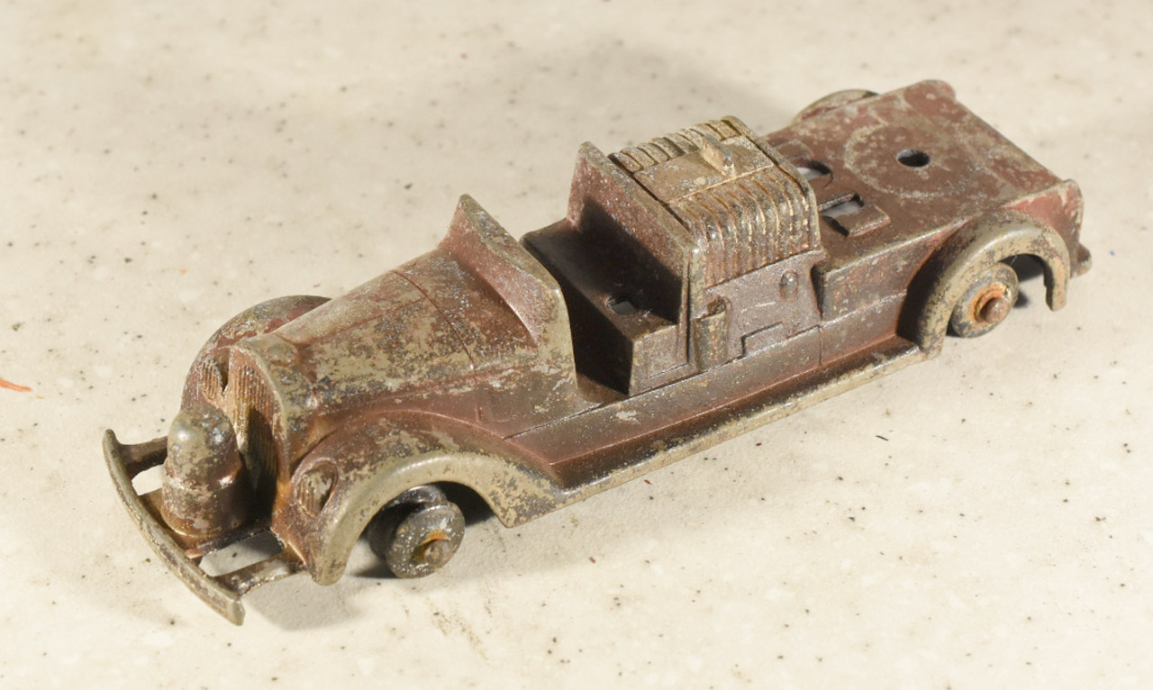One wonders if restoration is worth it. It is only a Tootsietoy. Well I will have a go and made it worthwhile. Strip and respray without a problem. I created a 3D pump on a swivel, not an exact match but look good. The original did not cover the ladder holes so I created a base to cover them.
