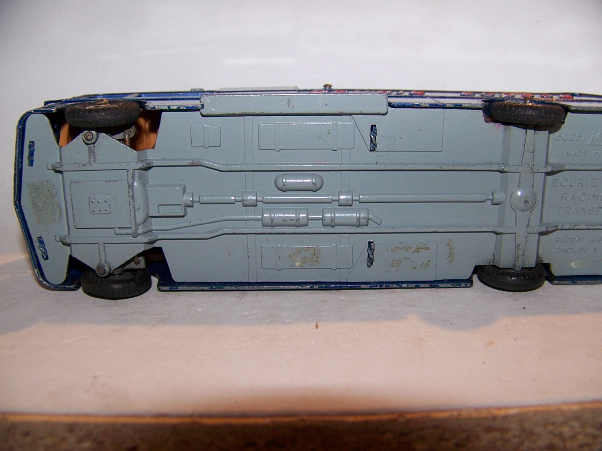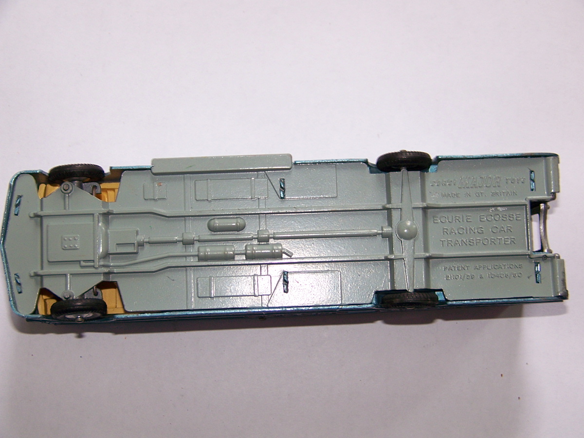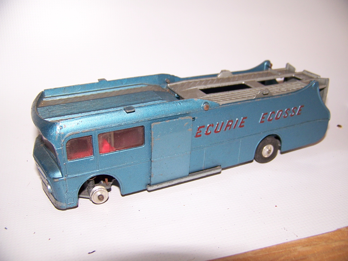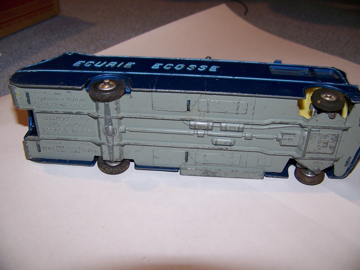 A mammoth project as this is the first of this size and a model in such a poor state. Some damage to the bodywork, window shell broken and missing bits, no rear ramp, full of dirt, no vice in the workshop, and a bad paint job. So a good clean up and all paint was stripped finishing with caustic soda and a fine wire brush on my drill. A good primer and two top coats before trial assembly. A final coat or two will be added as necessary. The front steering was removed by drilling out the rivet head, all components will be cleaned and lubricated before reassembly. The axle plate will be held in with screws should it ever be necessary to rebuild this model again. The Chassis was reassembled after cleaning and polishing all the parts. The front springs were re-tensioned before assembly and the rear springs were carefully rotated 180 degrees. A little WD40 to lubricate and all set to go. The broken windscreen and badly stained plastic interior will be tackled next. Ecurie Ecosse History (Team Scotland/images/Ecurrie Ecosse Chassis Restored.jpg)