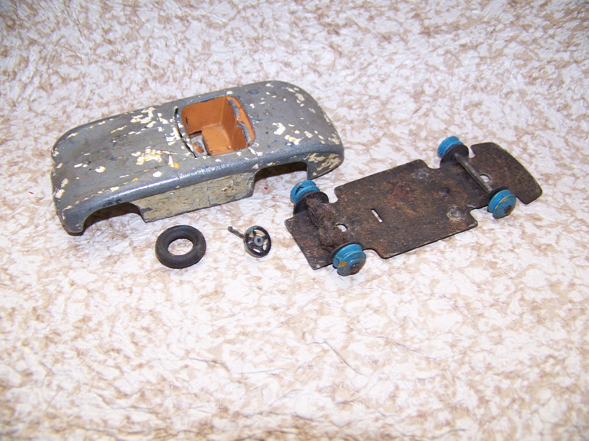 Badly over painted but in solid condition. The strip down was straight forward but the contents revealed one tire that had been squeezed inside the shell and one axle entwined with carpet fluff, showing something of it's history./images/101_3124.jpg)