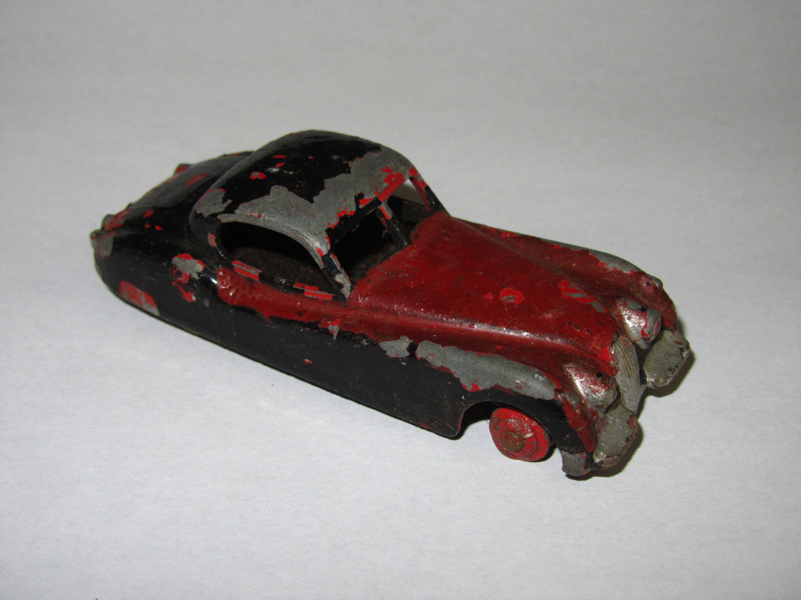 Received in very poor condition with the central windscreen pillar missing and part of a job lot of three. The chassis removed, paint stripped, and the pillar was replaced before a respray. The chassis was rusted so a brutal wire brush treatment was necessary before a coat of black paint was applied. The two color finish was achieved with masking tape and finished with a brush. Silver applied to the grille and bumpers finished this car off./images/XK120 front.jpg)