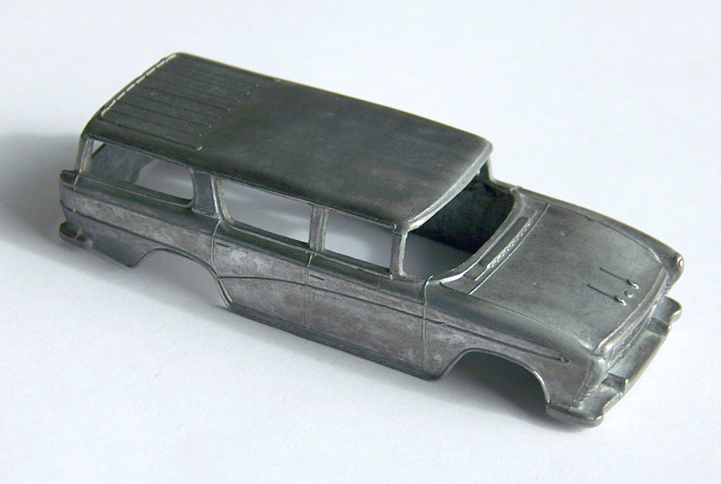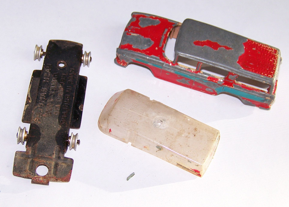 In a very poor state, badly repainted, 50% paint loss, rusty chassis, paint on windows, to name the main problems. The strip down was straightforward and paint stripping was easy, the chassis was wire brushed with a rotary tool, and the windows scraped of paint. The body was primed and a small ding in the hood was filled, a coat of primer and 3 top coats were applied. The spun hubs were masked and the chassis given a new coat of black paint. The windows were cleaned and polished with metal polish on a buffer using the rotary tool. Painted, not using the original pink./images/Nash Rambler Body Cleaned.jpg)