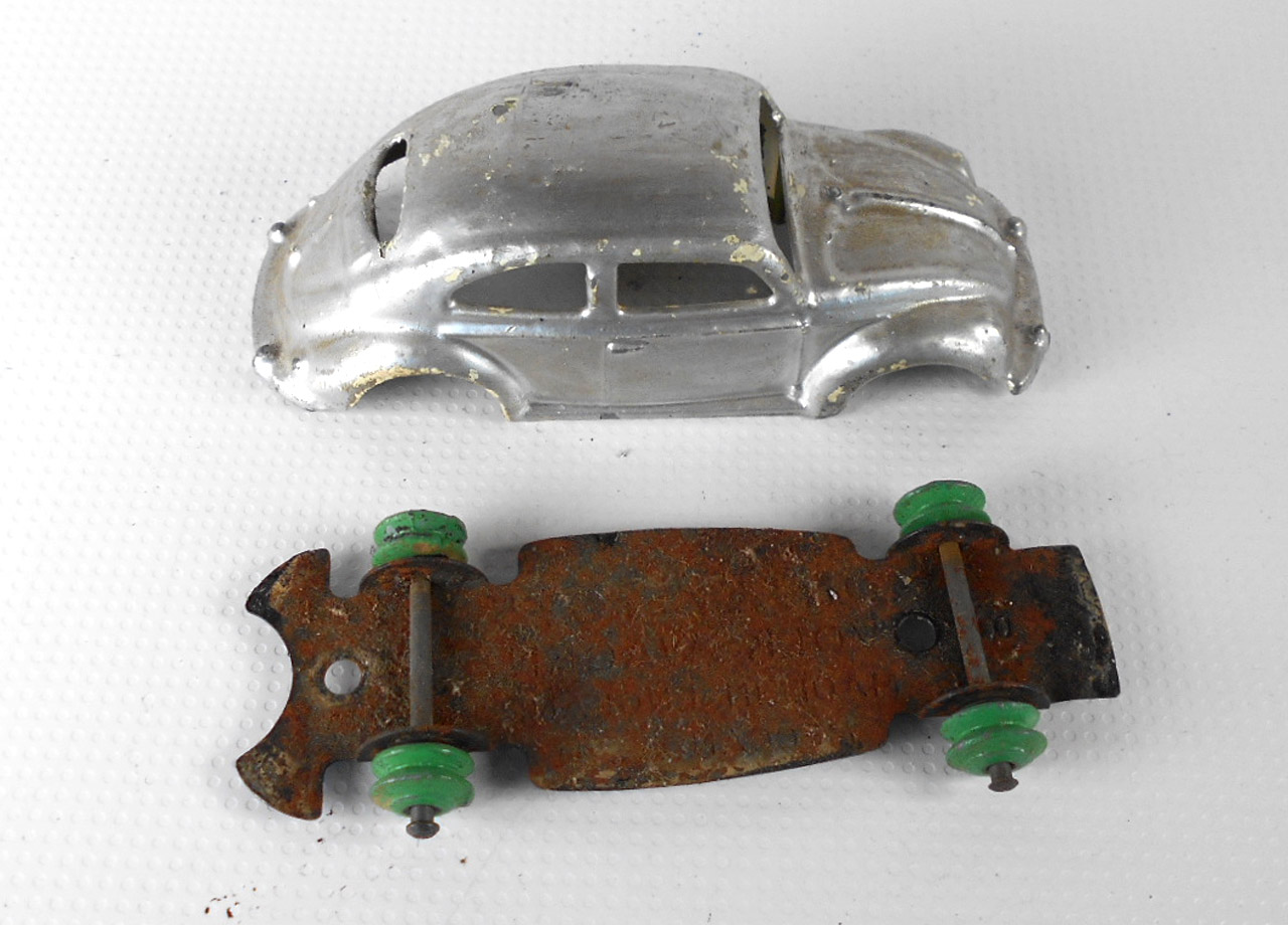 This silver painted VW was an early Dinky. I tried to remove the silver paint only using mild chemical stripper but it softened the original green paint. Later Dinky models had a hard baked paint that ould have resisted the stripper. So nice try but this now goes for a complete strip and repaint.
