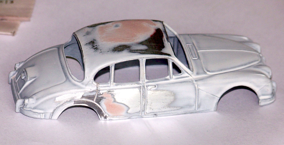 This Jaguar was badly dented but there were no cracks in the shell. The roof and one side was caved in and there was minor damage to the base and the perspex window shell was cracked. This may have been used as part of a crash scene but has very little value in the initial condition. The model was taken apart carefully so as to minimize any further damage. The body shell was gently tapped with a small hammer and flat punch until the profile was matched as close as possible. The next stage was to strip the paint and roughen the repaired area before adding some metal based epoxy resin to strengthen and to fill any blemishes left after removing the dents with the hammer and punch. After the resin has fully dried, file down to the correct profile and if necessary add more resin. Once a profile has been obtained smooth with 400 grit wet and dry and add a coat of primer. The primer will show any flaws which can then be filled and further re-profiled. On this model a sharp file point was used to re-creat/images/100_2399.jpg)