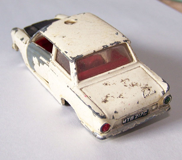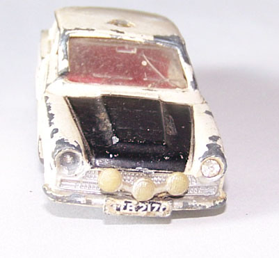 My first venture into a mode modern Dinky model. Made between 1965-1970 this model was made in different versions. The Mk1 Cortina was made as a regular saloon, a lotus and a rally car. The seat backs are missing, no steering wheel, doors almost off their hinges, one each jewelled headlamps front and back missing, top spotlight missing, only one tire, rusted axles and suspension, windscreen pillar broken, all begs the question if this is worth restoring. With a value on eBay of between $2 and $25 for a mint example, I guess not. After stripping and paint removal the door was tested for fit. The picture shows that the door is out of alignment which means the body shell is twisted. This will be corrected. So this one is going to get a Code 3 makeover./images/212 Ford Cortina Rally Base.jpg)