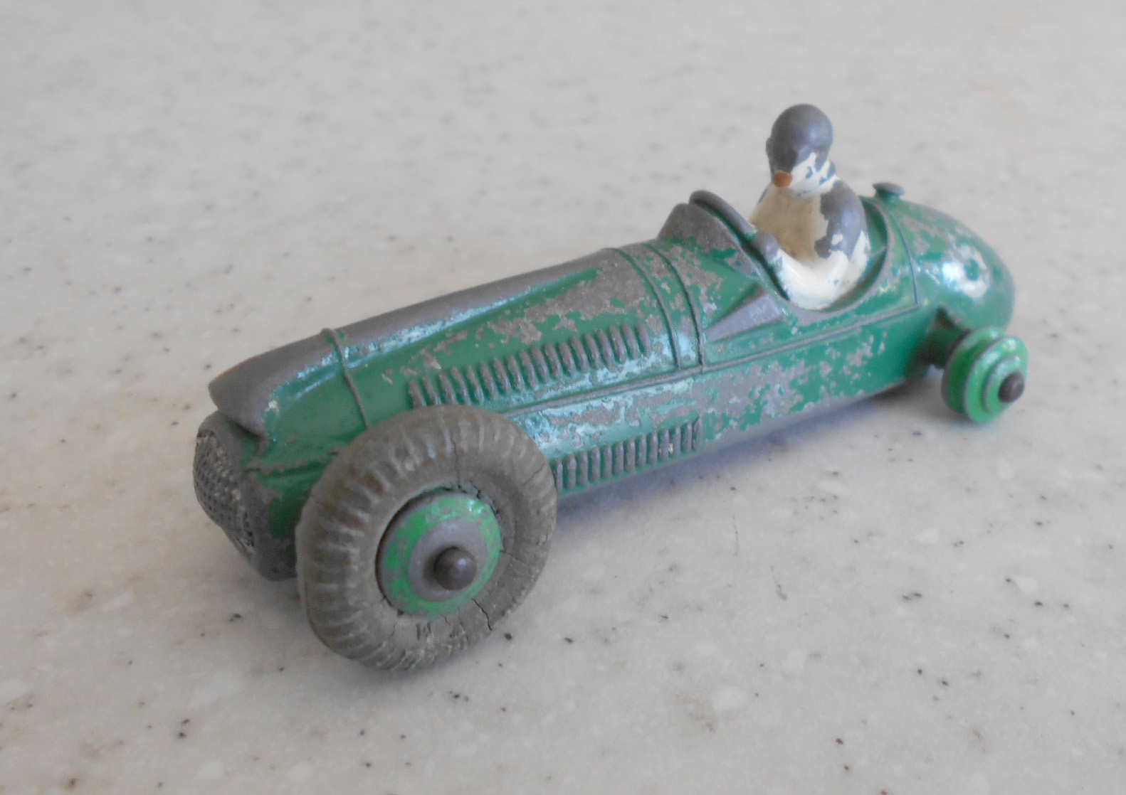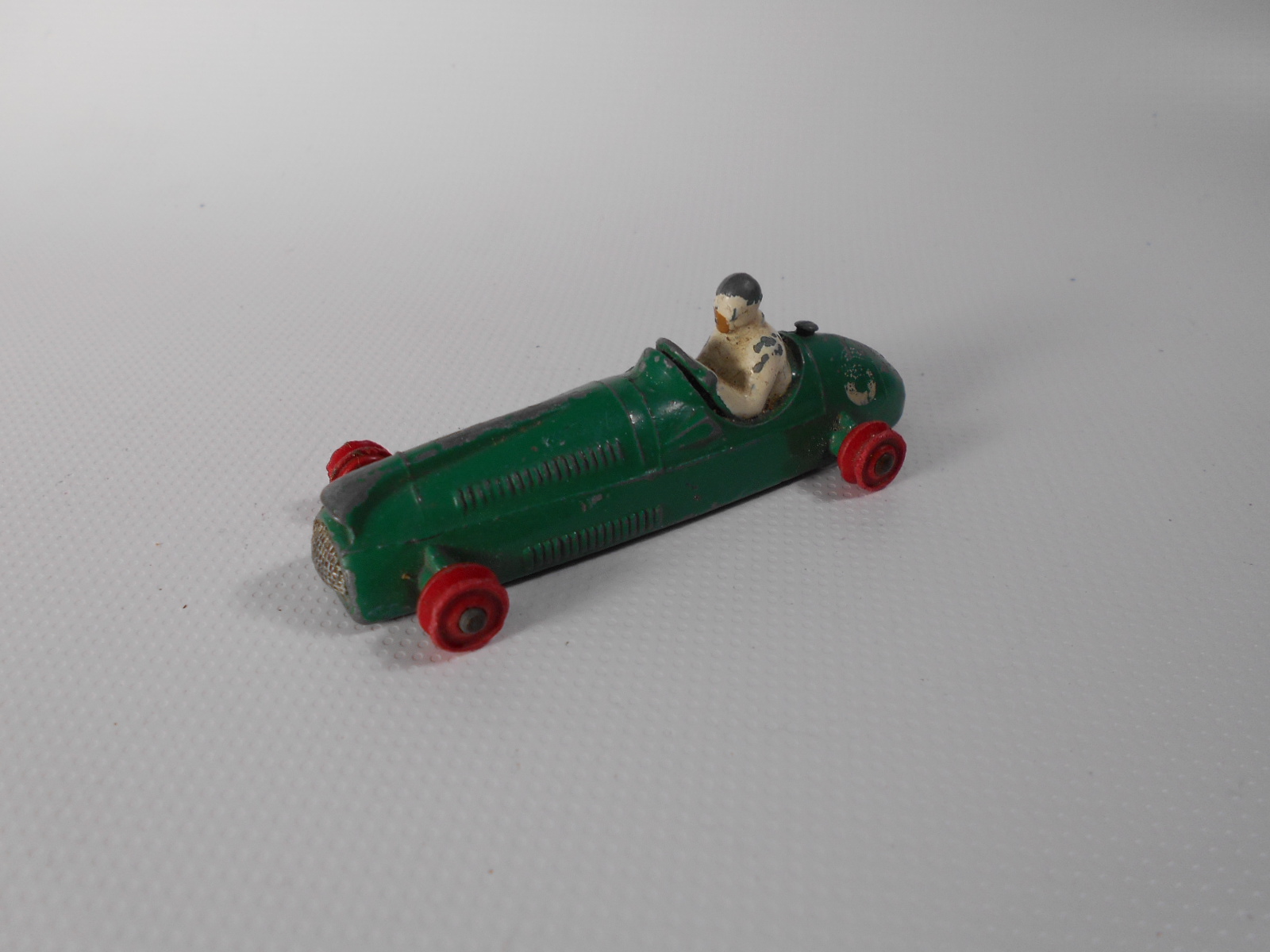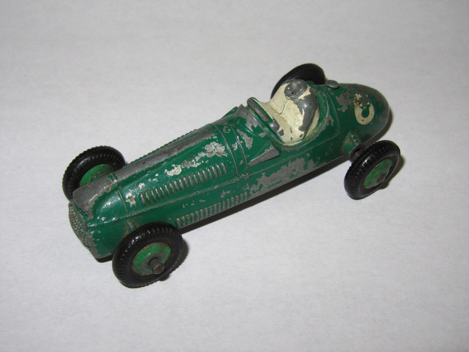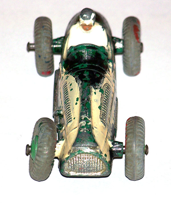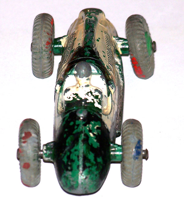 Complete but badly repainted. Hard and cracked rubber tires. Purchased on eBay. The first task will be to disassemble and strip the paint. The strip down was straight forward. The rivets were drilled out using a #43 bit, followed by a larger size to break the rivet top. Care was taken to ensure the initial hole was centered and breaking the rivet top did not damage the chassis. The choice of a #43 bit was that it could be re-riveted or tapped and screwed. The ends of the axles were tapped flat and the wheels removed. One end of the axle was originally tapped over and this is the end that was tapped flat. A small hammer and anvil is ideal for this. The next stage is to strip the paint and I use aircraft paint stripper. It is very corrosive so no getting it on your hands or breathing in the fumes, but it does work very well. A good wash in soapy water is good enough to prepare for new paint. For some reason the white paint used for the driver was difficult to remove, a little sand blasting may have hel/images/cooper-bristol-233 broken down.jpg)