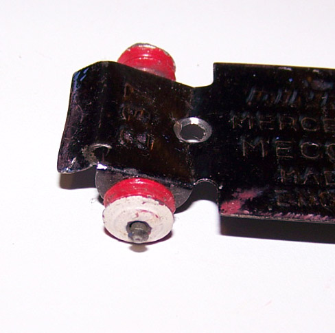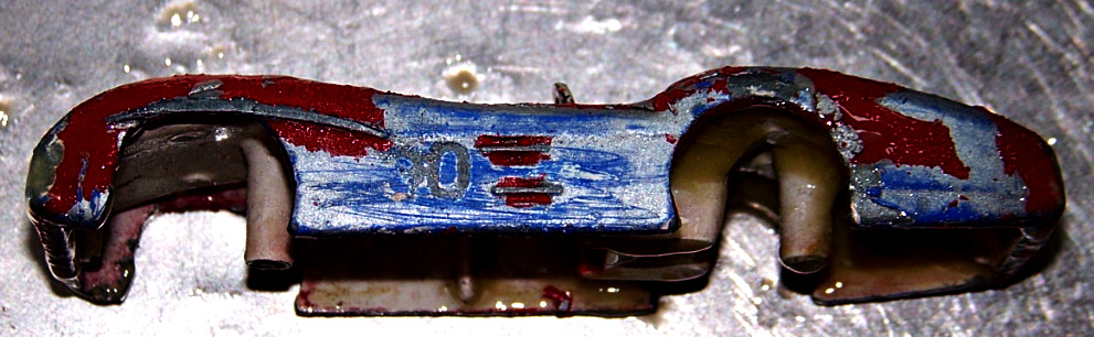 Front end damage, front wheels jammed and a buckled chassis marks this one as a necessary restore. No driver but otherwise complete. Several repaints but the original cream and red hubs. The newer paint was removed with a gentle paint remover hoping to find the number decal. The number was found and it was the standard 30 (see photo). The chassis was removed and straightened and lined up with the body showing only 1cm of body damage. The body was dressed back into shape and the chassis fitted perfectly with the wheels now turning freely./images/237 Mercedes Chassis Body Realigned 2.jpg)