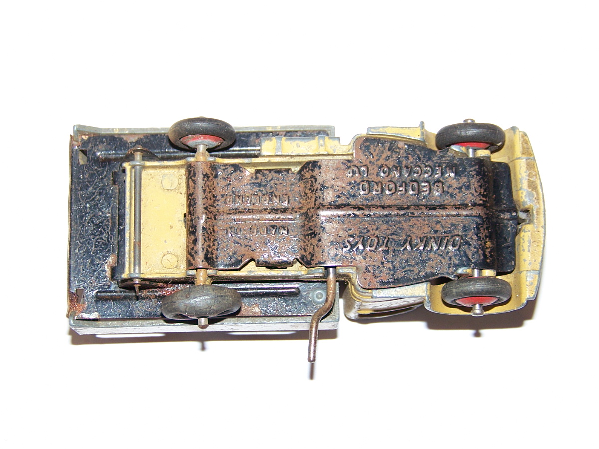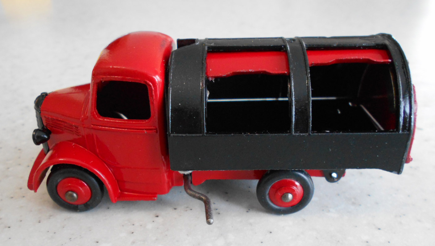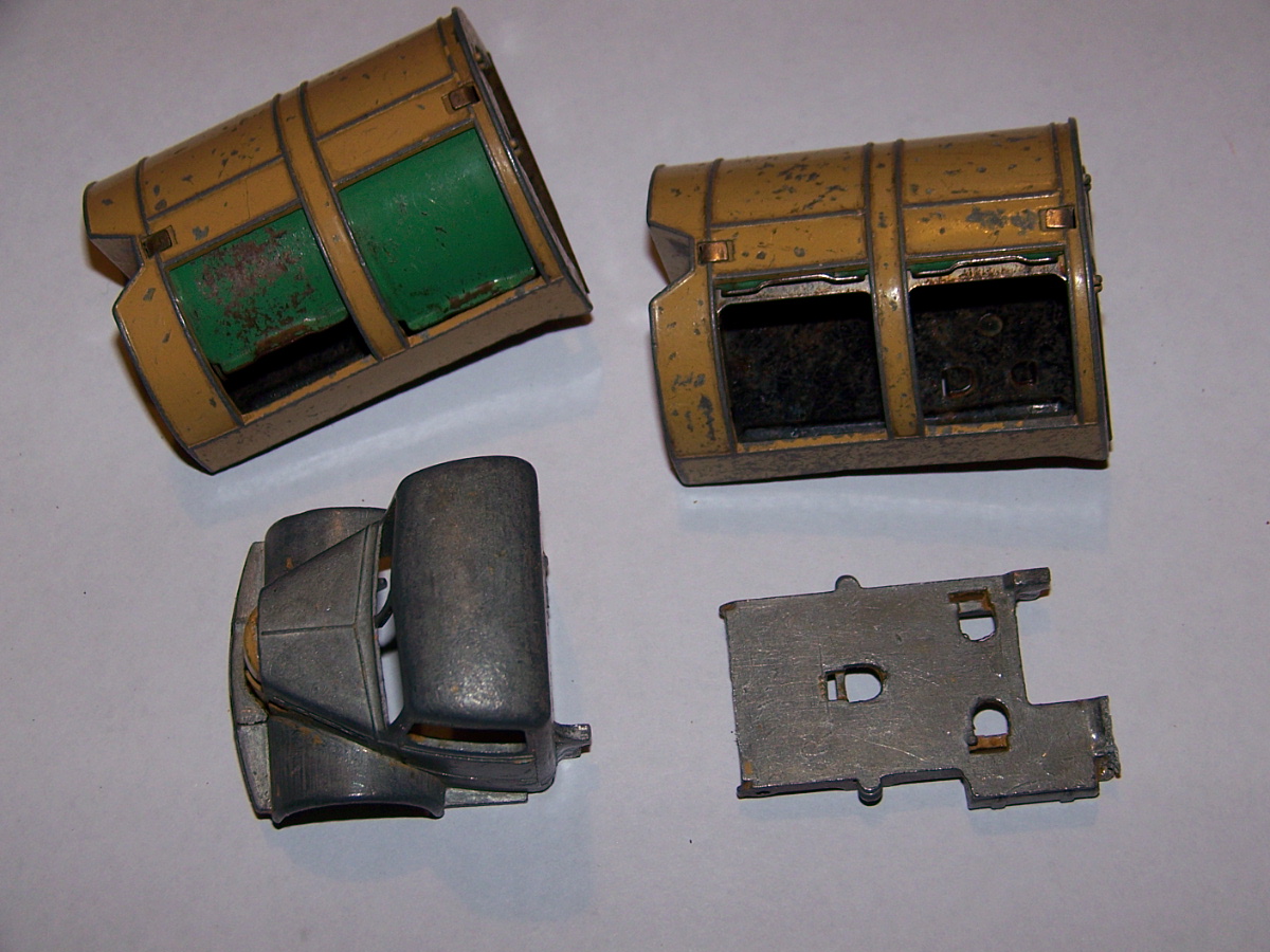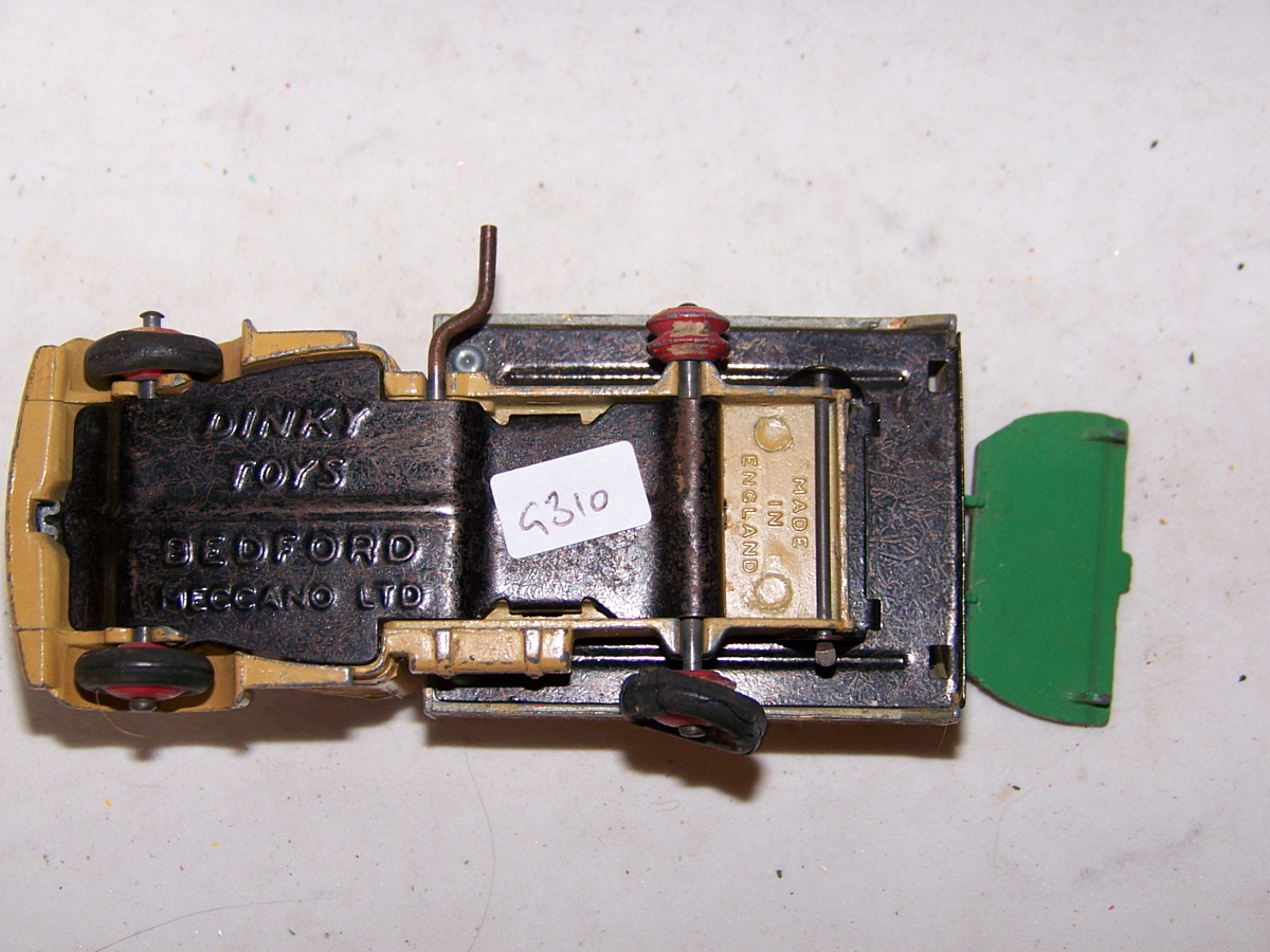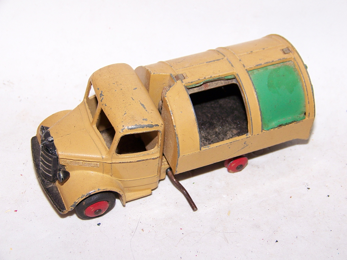 Well in need of restoration, this Bedford Refuse Truck totally scabby and the tipper winder seized, back door missing, very rough condition. The strip down was tricky as I wanted not to destroy the winder mechanism. Without the box being elevated the tabs on the base could not be released and therefore the winder could not be released. However, I did find that the base of the box could be removed and thus access to the tabs on the base. A hook was used to pull the tabs and the winder gear could be wriggled free. The winder gear was then soaked in WD40 for an hour or so and gentle twisting freed up the gear. Never be in a hurry to strip down and never use force on the gears. Gentle persuasion is all that is needed and it is quite rewarding to have it all working again. The radiator/headlamp unit was prized forward to release it. In the meantime, the paint was stripped from the body and chassis and rough spots rubbed down. The tin parts have yet to be cleaned before reassembly. Tips: The basep/images/100_2308.jpg)