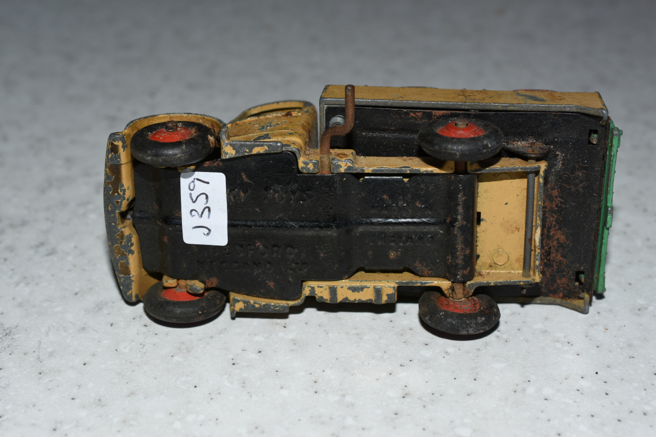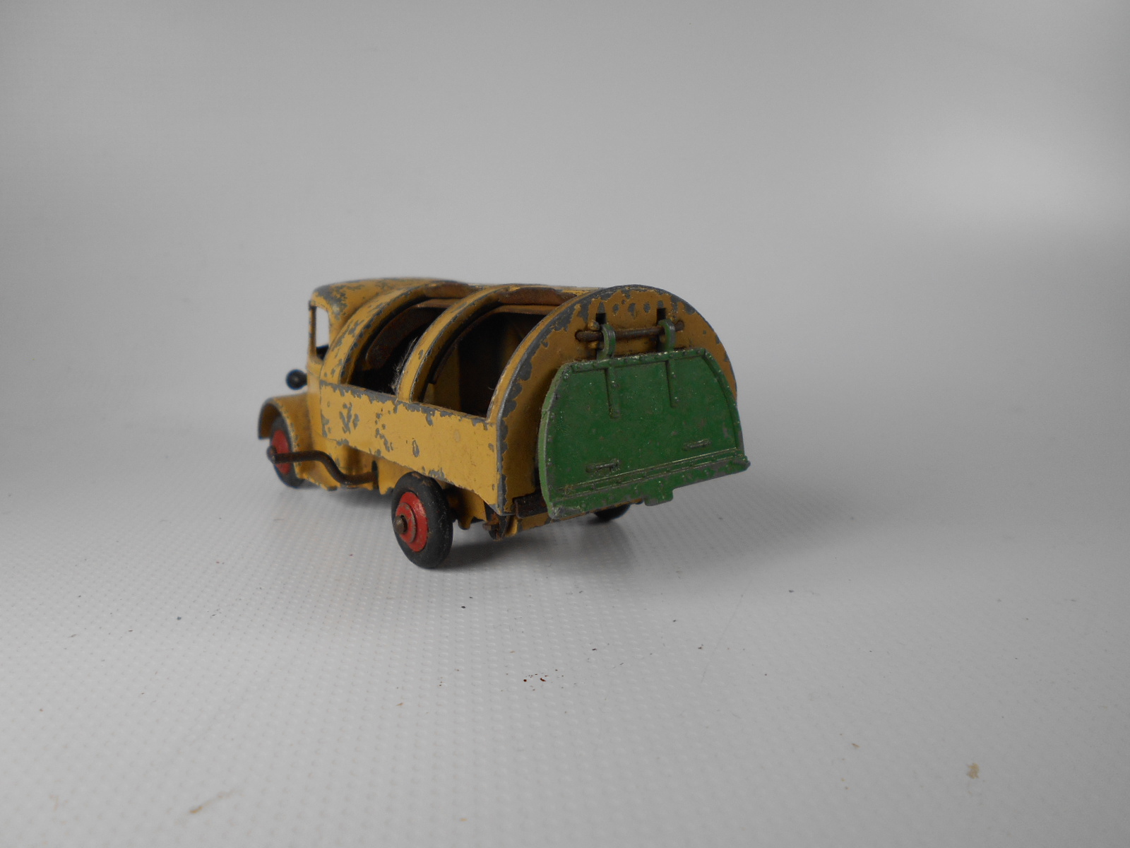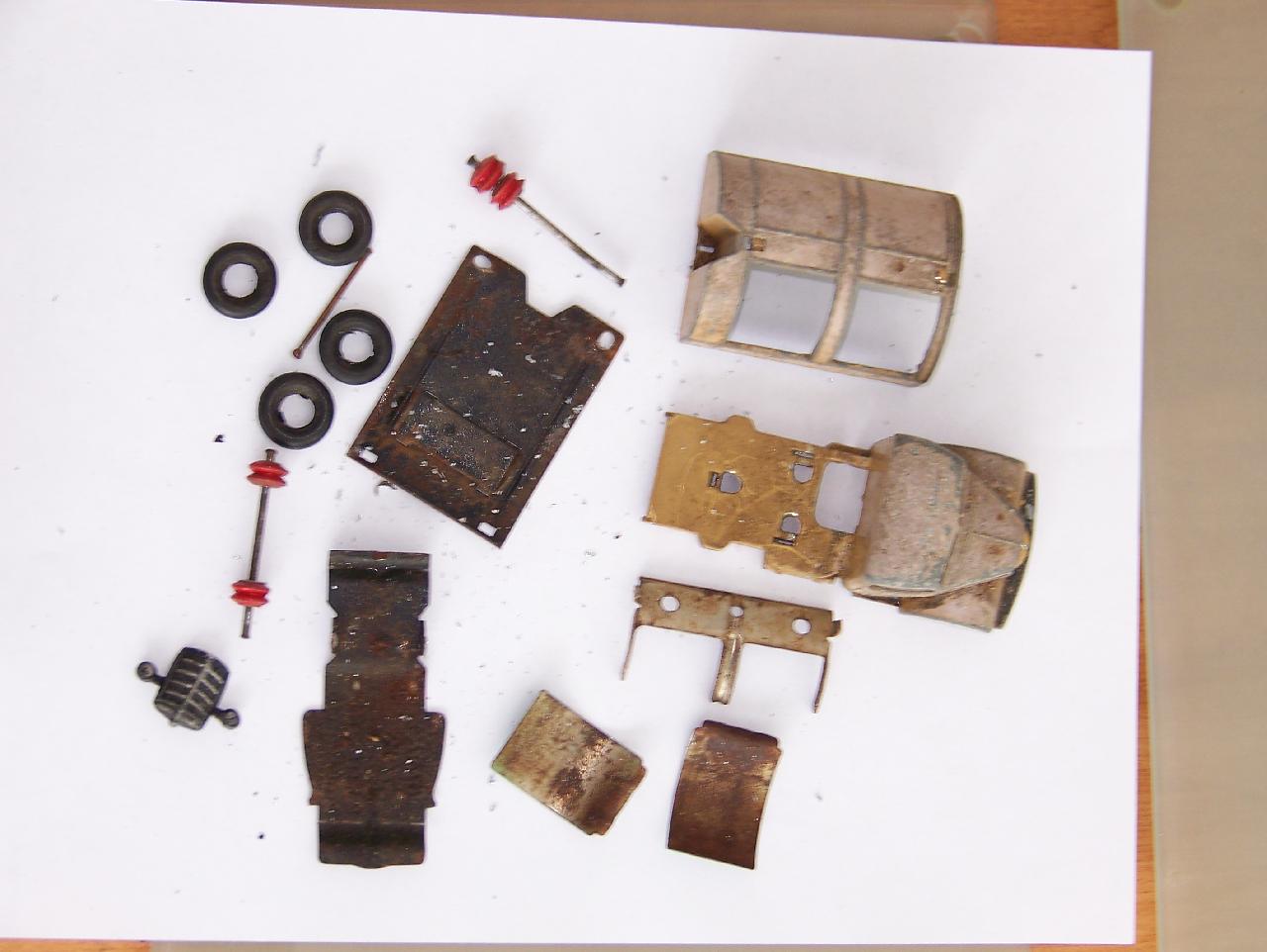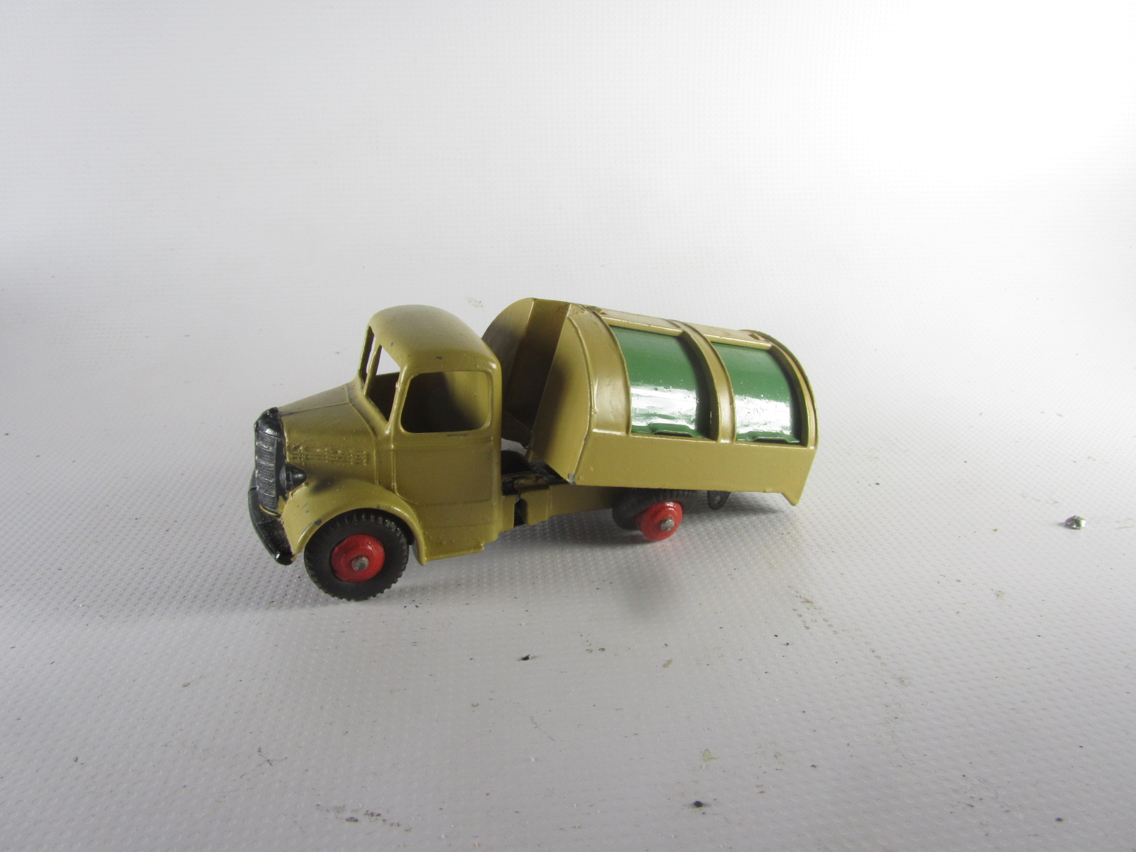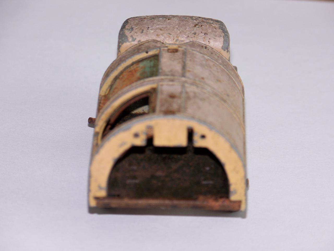 Well in need of restoration, this Bedford Refuse Truck totally scabby and the tipper winder seized, back door missing, very rough condition. The strip down was tricky as I wanted not to destroy the winder mechanism. Without the box being elevated the tabs on the base could not be released and therefore the winder could not be released. However, I did find that the base of the box could be removed and thus access to the tabs on the base. A hook was used to pull the tabs and the winder gear could be wriggled free. The winder gear was then soaked in WD40 for an hour or so and gentle twisting freed up the gear. Never be in a hurry to strip down and never use force on the gears. Gentle persuasion is all that is needed and it is quite rewarding to have it all working again. The radiator/headlamp unit was prized forward to release it. In the meantime, the paint was stripped from the body and chassis and rough spots rubbed down. The tin parts have yet to be cleaned before reassembly. Tips: The basep/images/100_2308.jpg)
