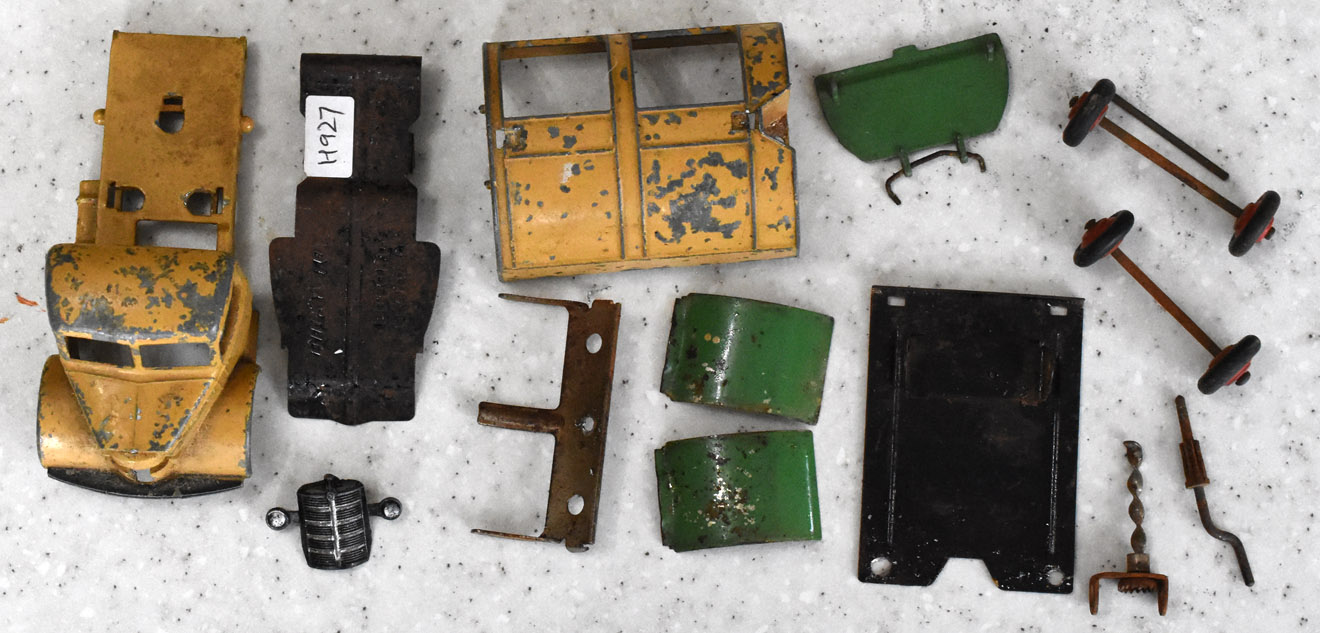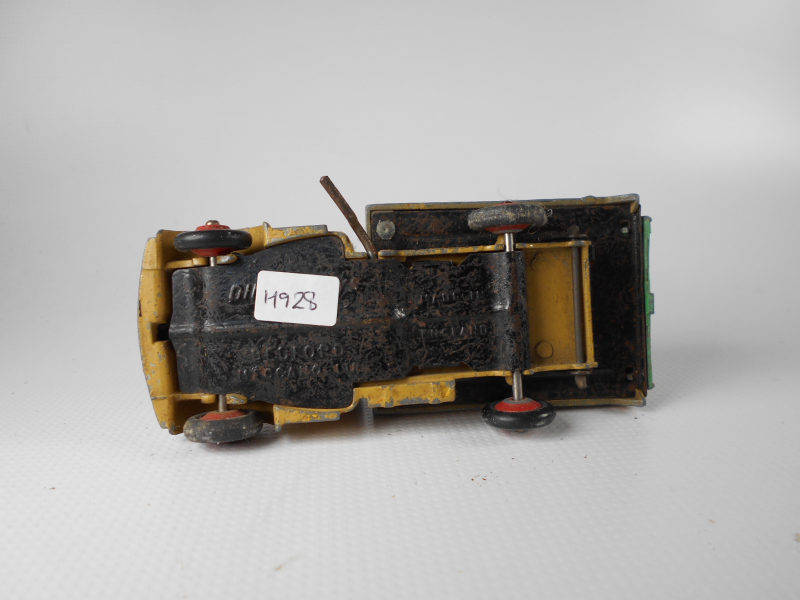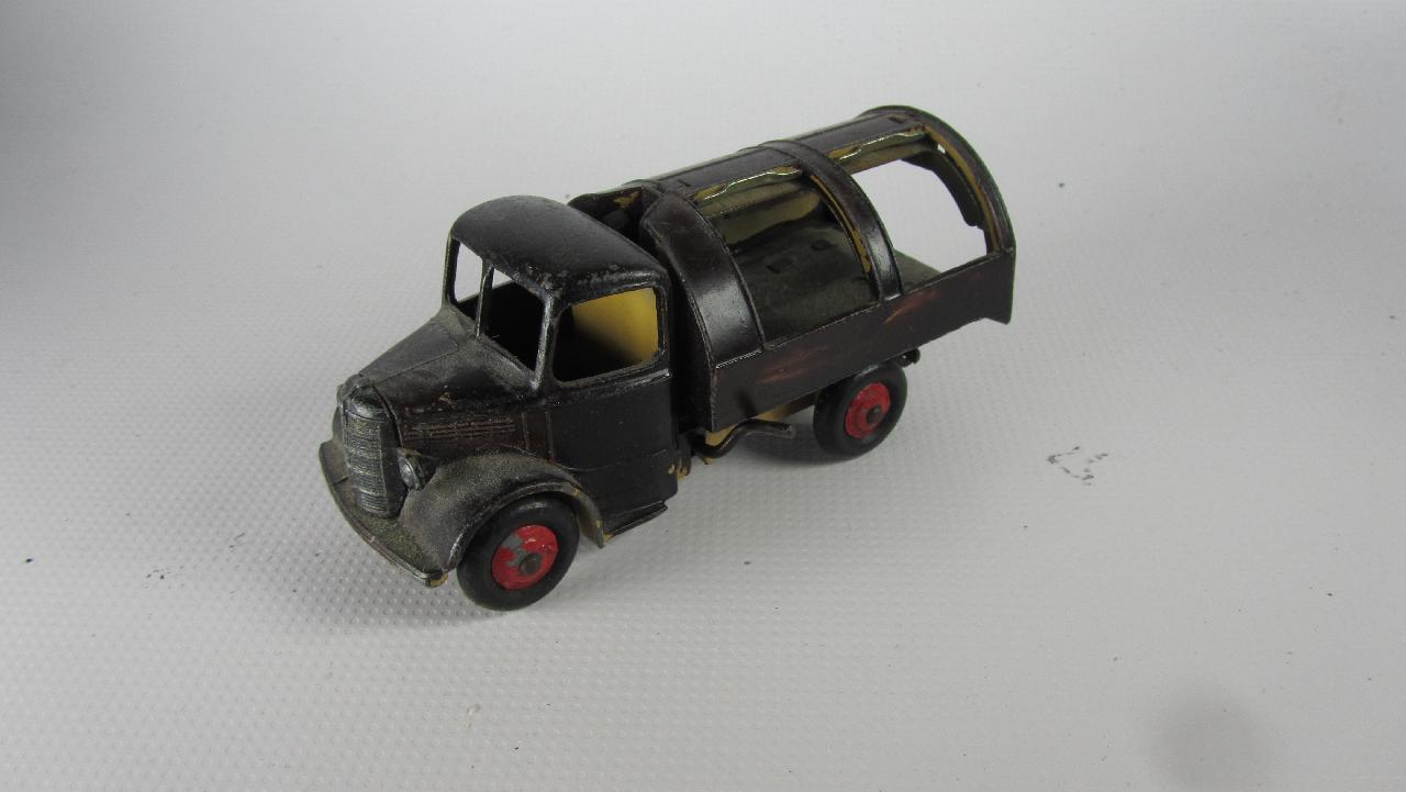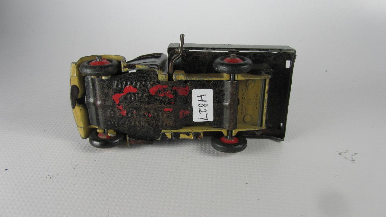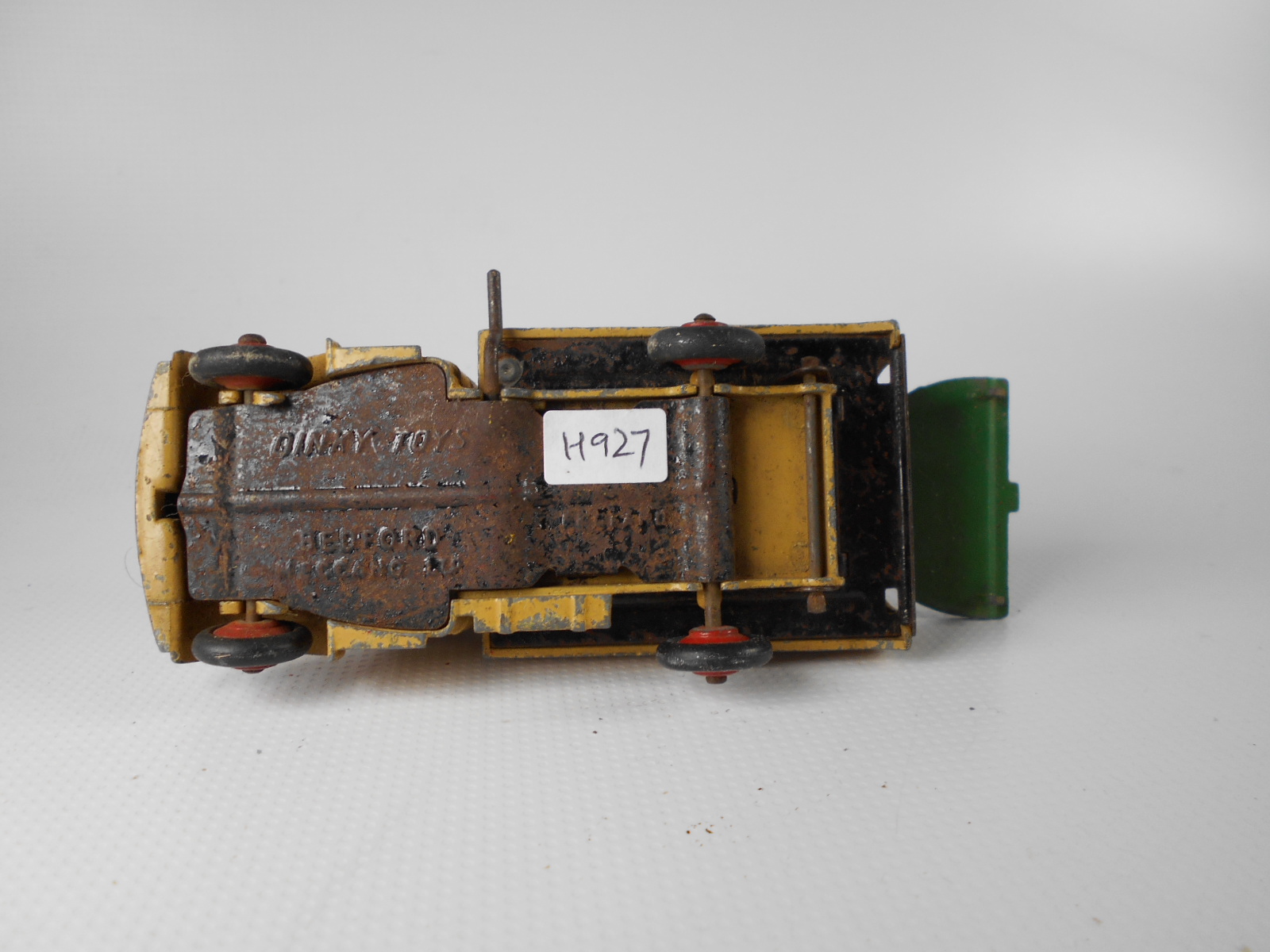 Well in need of restoration, this Bedford Refuse Truck totally scabby and the tipper winder seized, back door missing, very rough condition. The strip down was tricky as I wanted not to destroy the winder mechanism. Without the box being elevated the tabs on the base could not be released and therefore the winder could not be released. However, I did find that the base of the box could be removed and thus access to the tabs on the base. A hook was used to pull the tabs and the winder gear could be wriggled free. The winder gear was then soaked in WD40 for an hour or so and gentle twisting freed up the gear. Never be in a hurry to strip down and never use force on the gears. Gentle persuasion is all that is needed and it is quite rewarding to have it all working again. The radiator/headlamp unit was prized forward to release it. In the meantime, the paint was stripped from the body and chassis and rough spots rubbed down. The tin parts have yet to be cleaned before reassembly. Tips: The basep/images/100_2308.jpg)