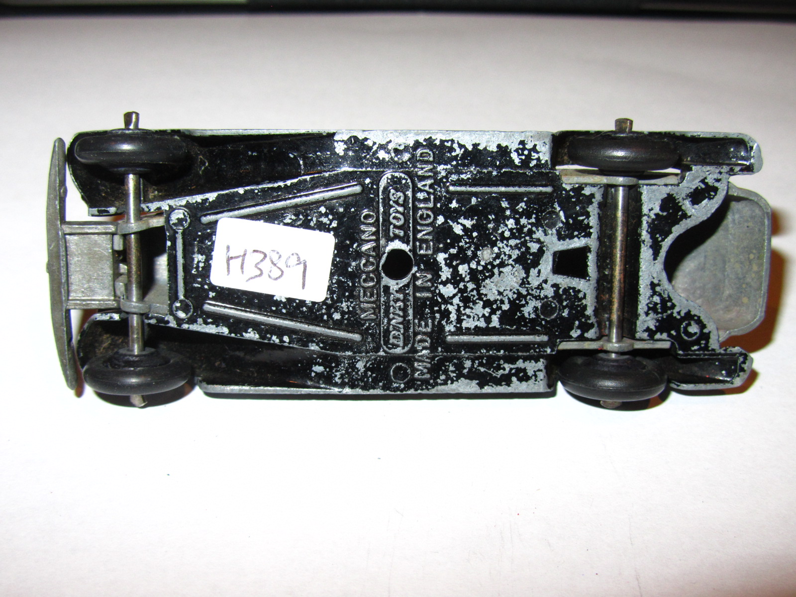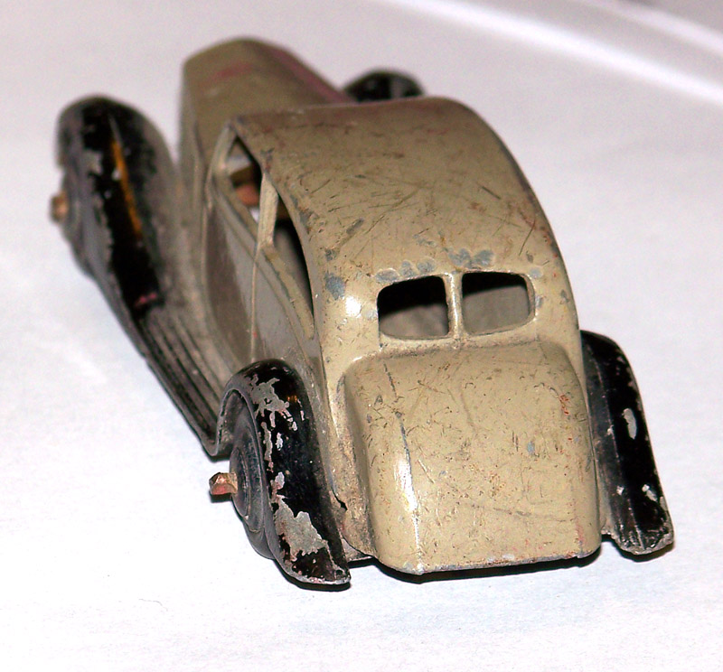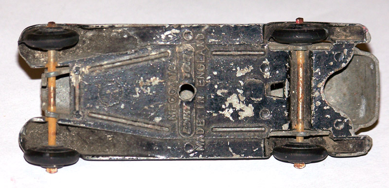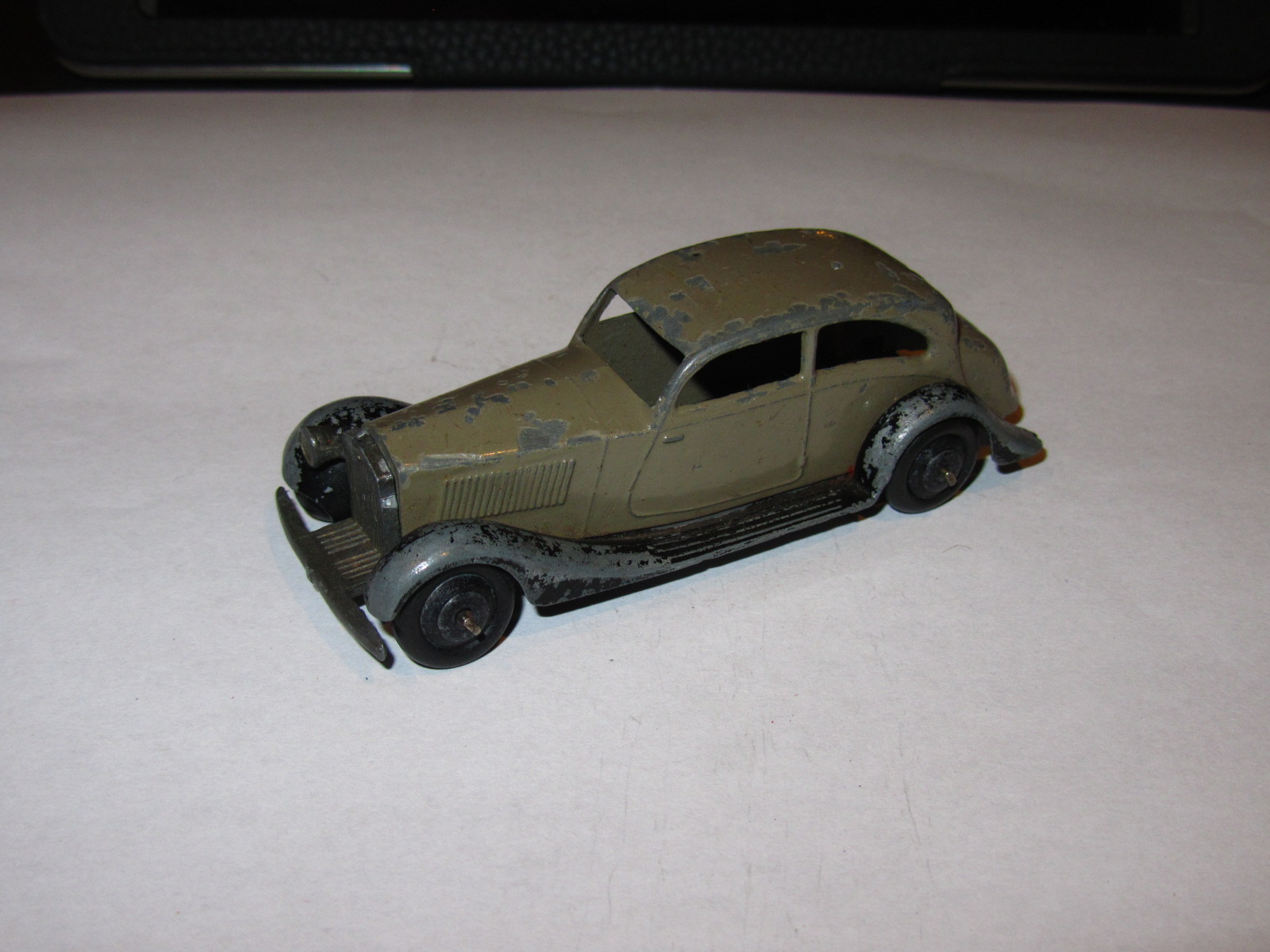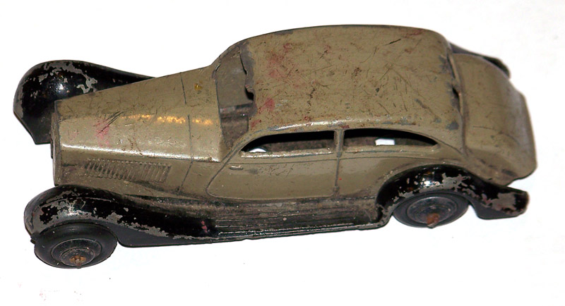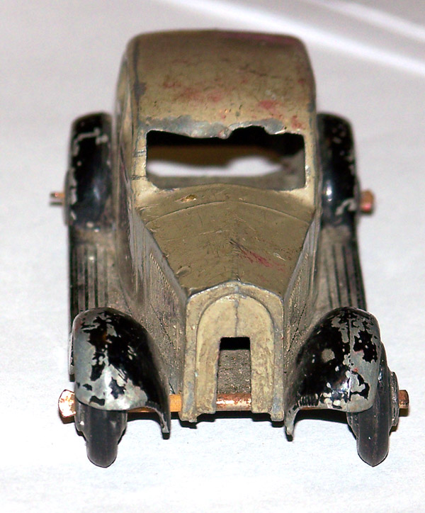 I had a hard job trying to identify this model. The front was so much like the Rover but on comparing listings from eBay and other sites (see links) I concluded it was the Rolls. As purchased with damage to the windscreen roof area, and I think a set of new tires has been added. Missing the grille and headlamps, easily replaced, restoration will take place soon (have to finish the others first!) So after a complete strip down the roof was repaired by gentle tapping with a hammer and finishing with an epoxy metal paste. New axles were made from fencing wire. The replacement grille was poor quality so I may have to find something better. But it is vastly improved over the poor specimen that I started with./images/Rolls Royce 30b back.jpg)