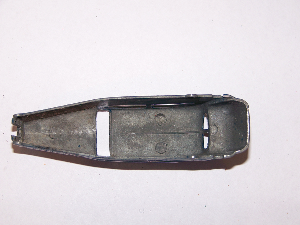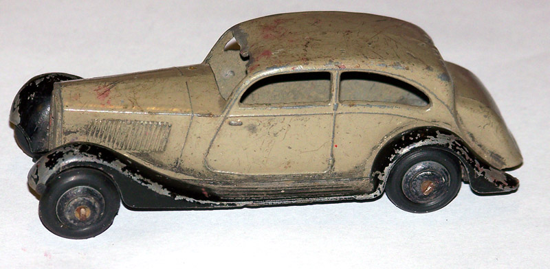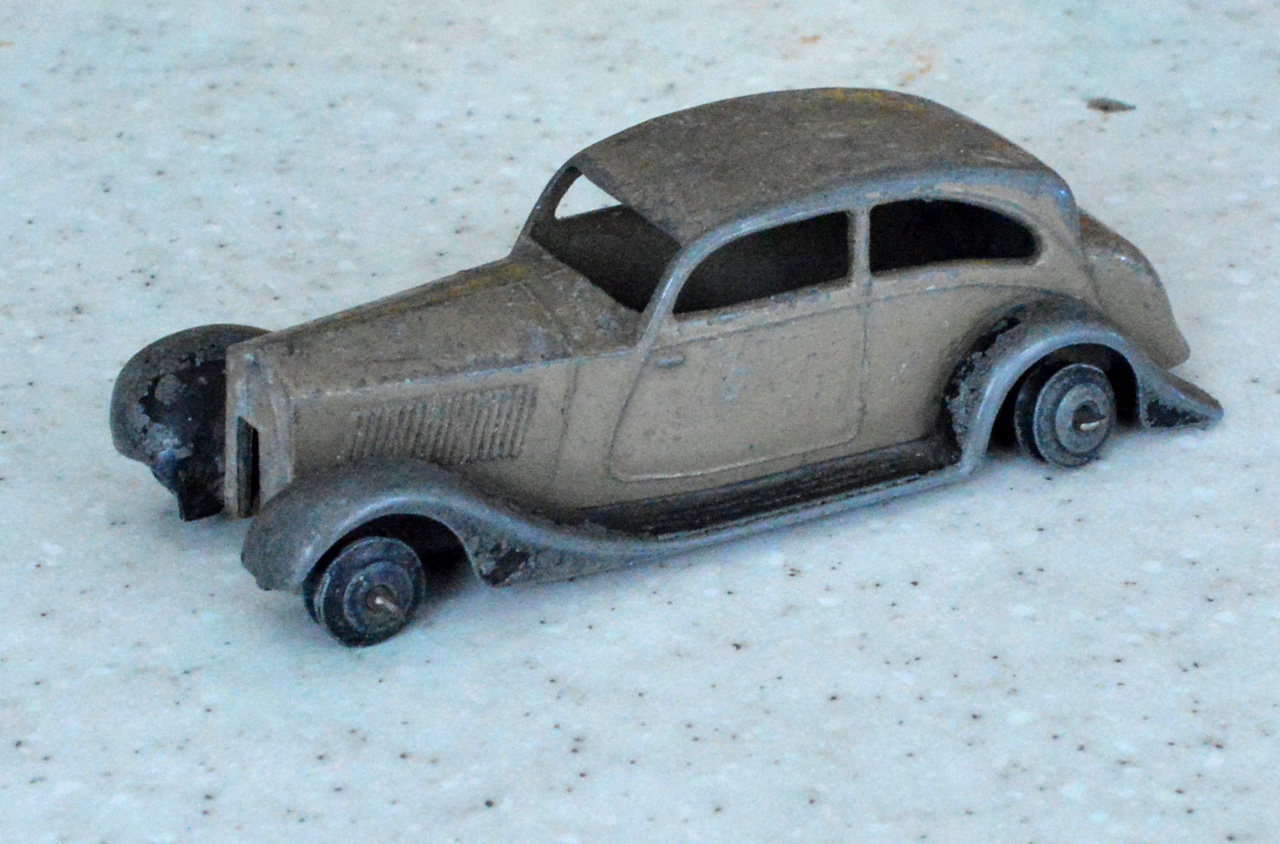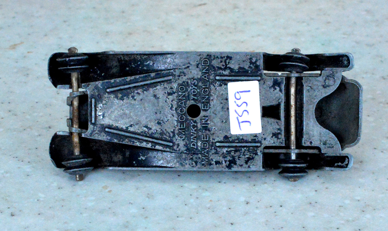 I had a hard job trying to identify this model. The front was so much like the Rover but on comparing listings from eBay and other sites (see links) I concluded it was the Rolls. As purchased with damage to the windscreen roof area, and I think a set of new tires has been added. Missing the grille and headlamps, easily replaced, restoration will take place soon (have to finish the others first!) So after a complete strip down the roof was repaired by gentle tapping with a hammer and finishing with an epoxy metal paste. New axles were made from fencing wire. The replacement grille was poor quality so I may have to find something better. But it is vastly improved over the poor specimen that I started with./images/Rolls Royce 30b back.jpg)
