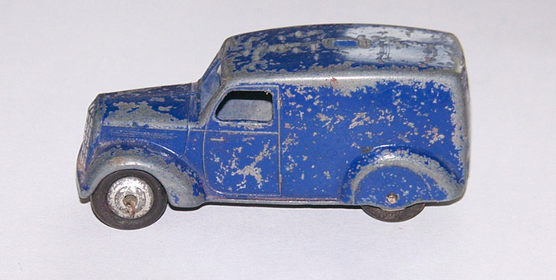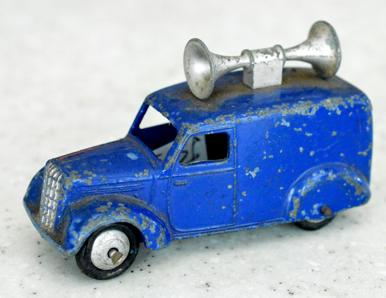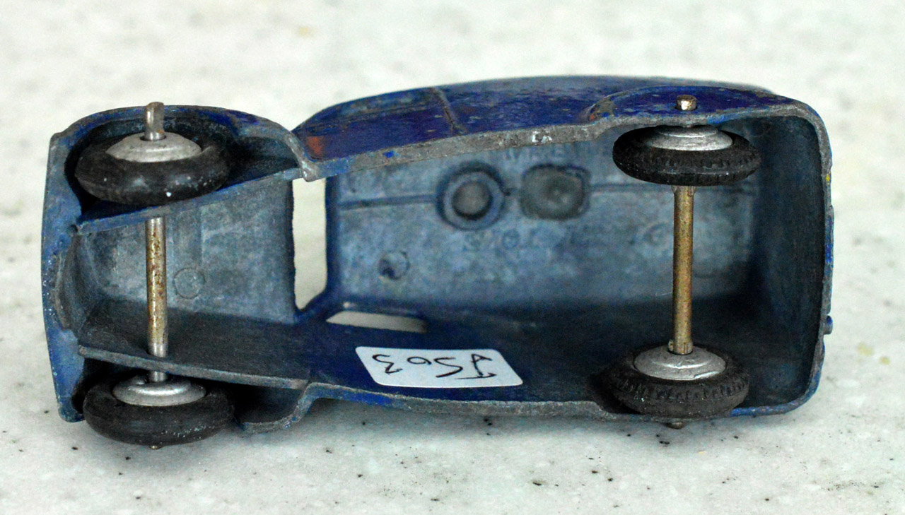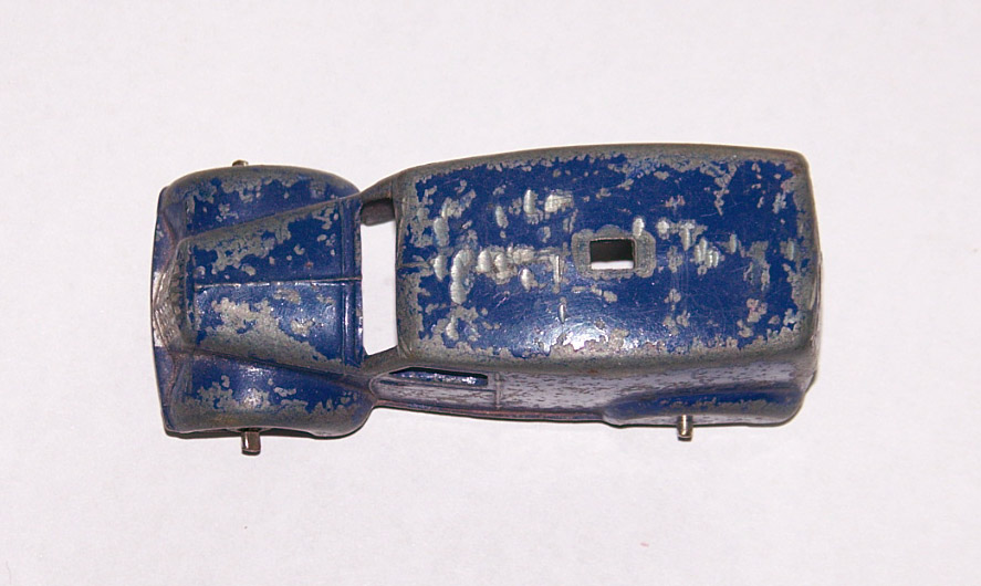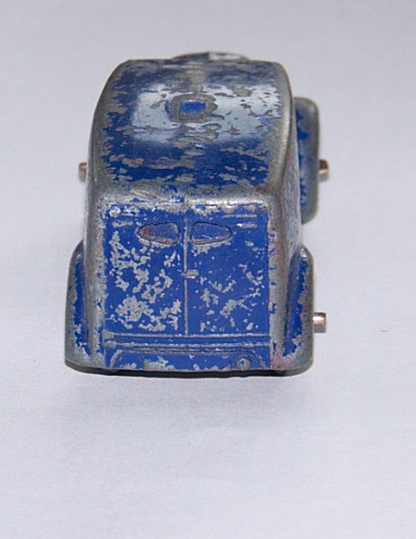 Blue with silver hubs make this a type 1. The speakers have been forced off leaving chips to the roof. Shame to have a type 1 with damage. This one may get a Code 3 make over. So eventually I decided to put this back in the original condition. The roof was repaired and the car was primed and painted. The loudspeakers were replaced and cemented in place with metal based epoxy resin. Some thin card was used to position the speaker heads slightly off the roof while the resin dried. In Progress/images/Van 34c Back.jpg)