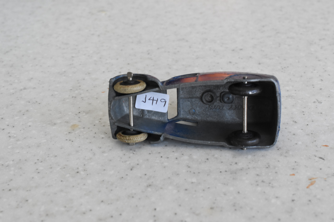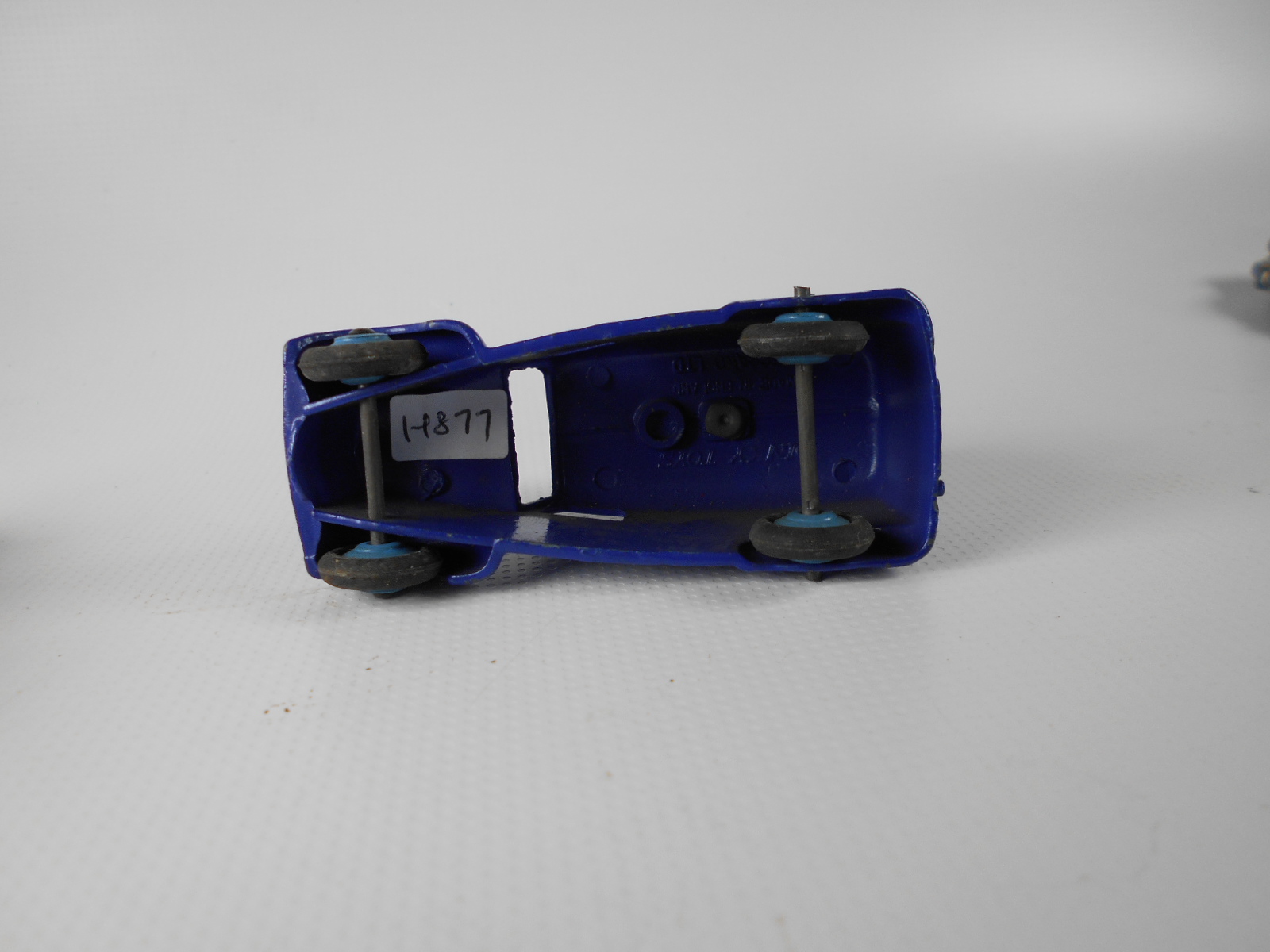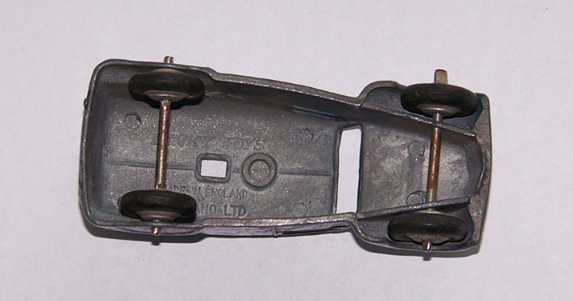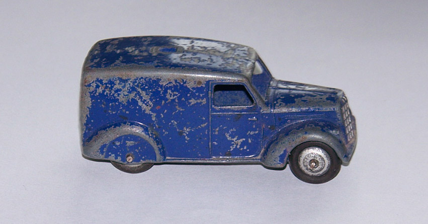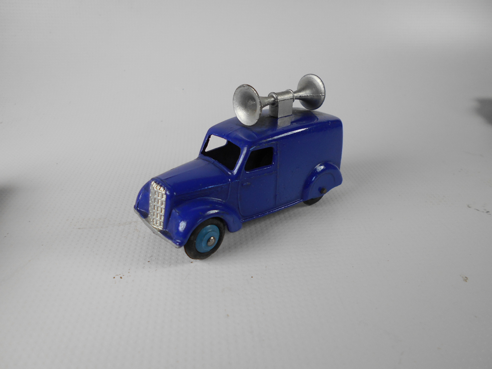 Blue with silver hubs make this a type 1. The speakers have been forced off leaving chips to the roof. Shame to have a type 1 with damage. This one may get a Code 3 make over. So eventually I decided to put this back in the original condition. The roof was repaired and the car was primed and painted. The loudspeakers were replaced and cemented in place with metal based epoxy resin. Some thin card was used to position the speaker heads slightly off the roof while the resin dried. In Progress/images/Van 34c Back.jpg)