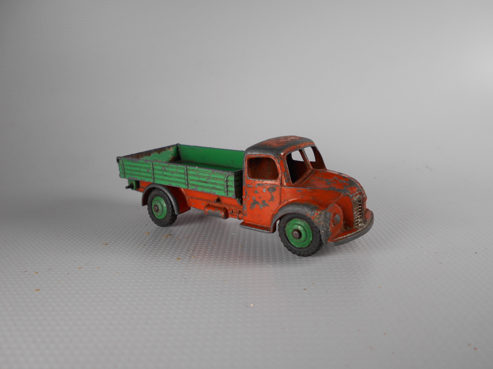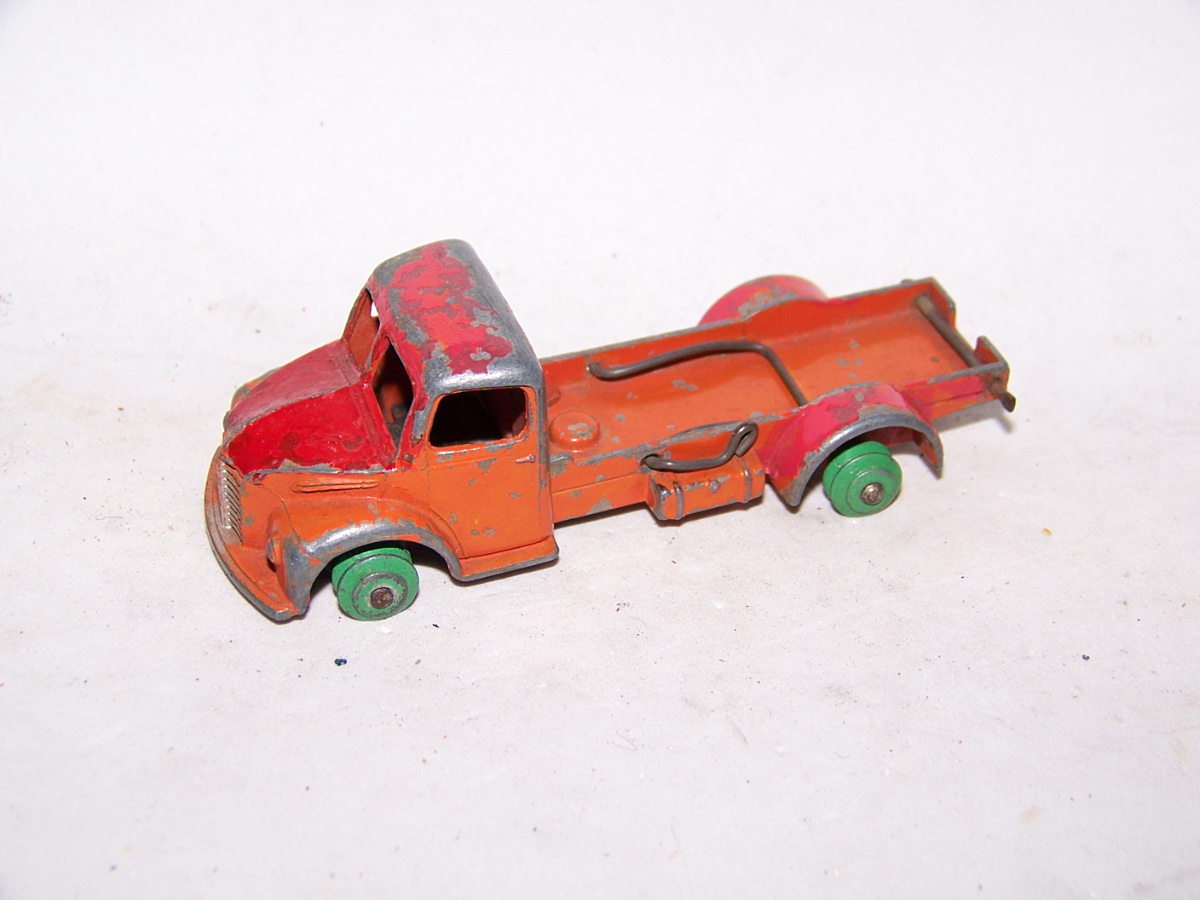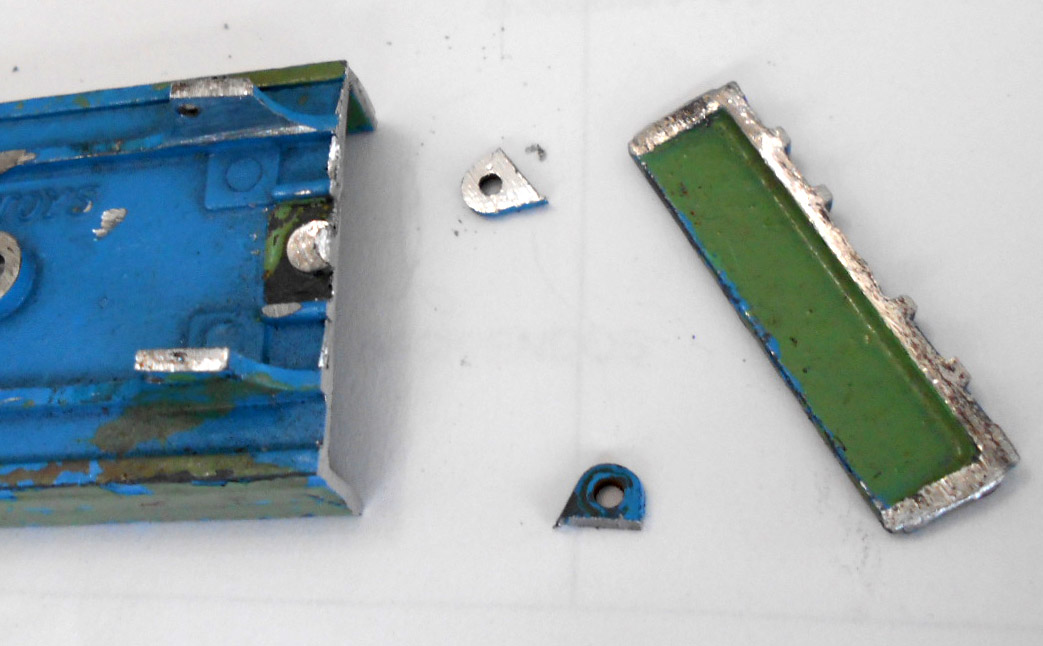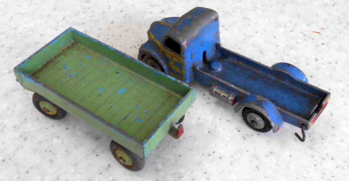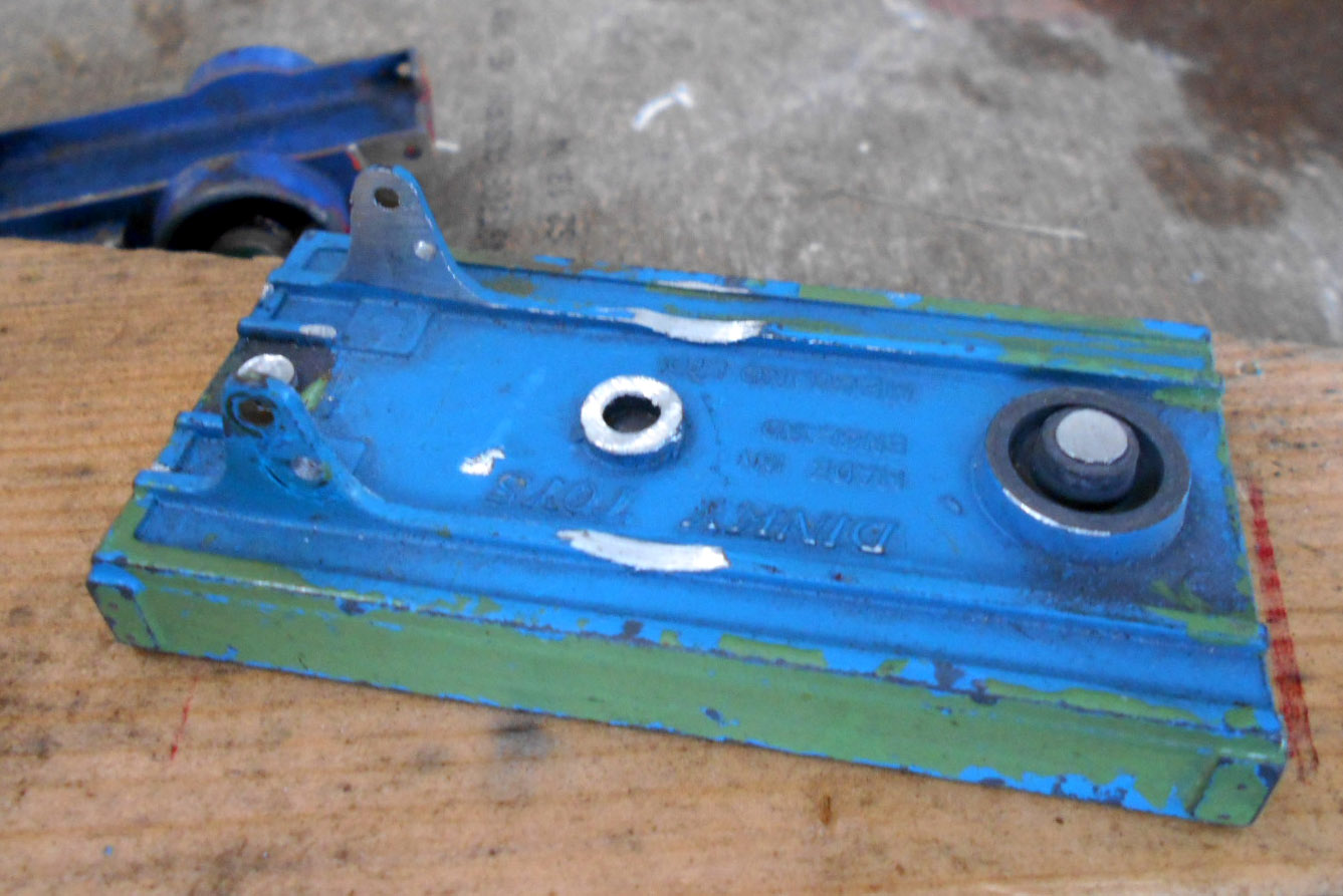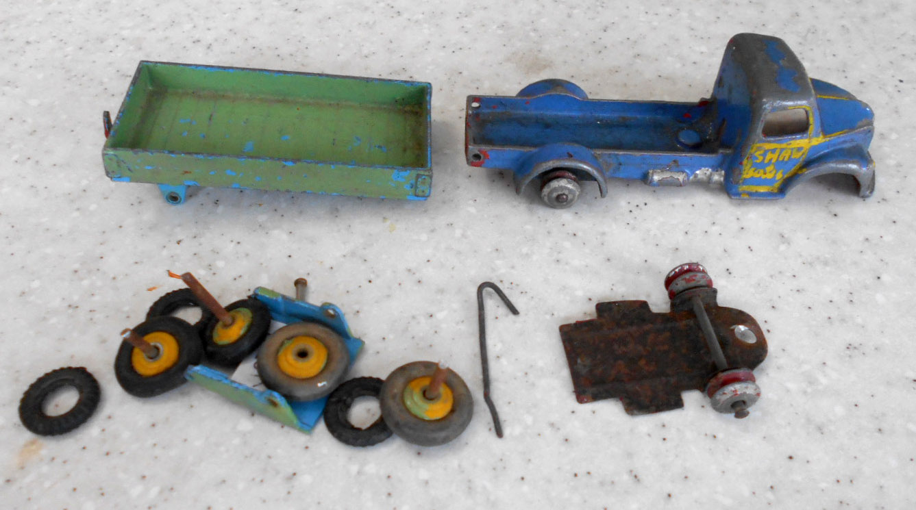 This model had the rear bed missing which is quite common. So I thought of a replacement by using the 4 wheel hand trailer that was missing the drawbar and the hinge hole was broken off. The dimensions looked OK but on matching up the tipping hinge width was just a few 100ths out, but by careful trimming it fitted just fine with new holes drilled in the trailer part just gave enough clearance. The rear end was removed and trimmed to fit and a hinge added. I may redo this part, not quite happy with it but it works. A new lifting mechanism was created and it all went together quite well. Note the images to see additional trimming to the trailer part.