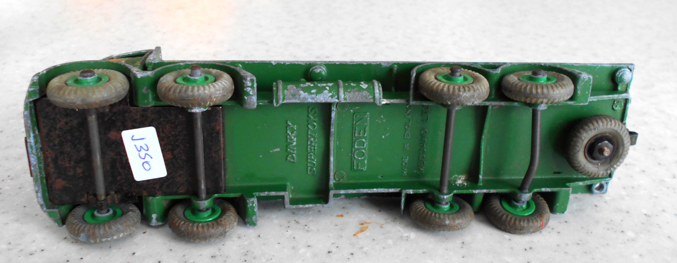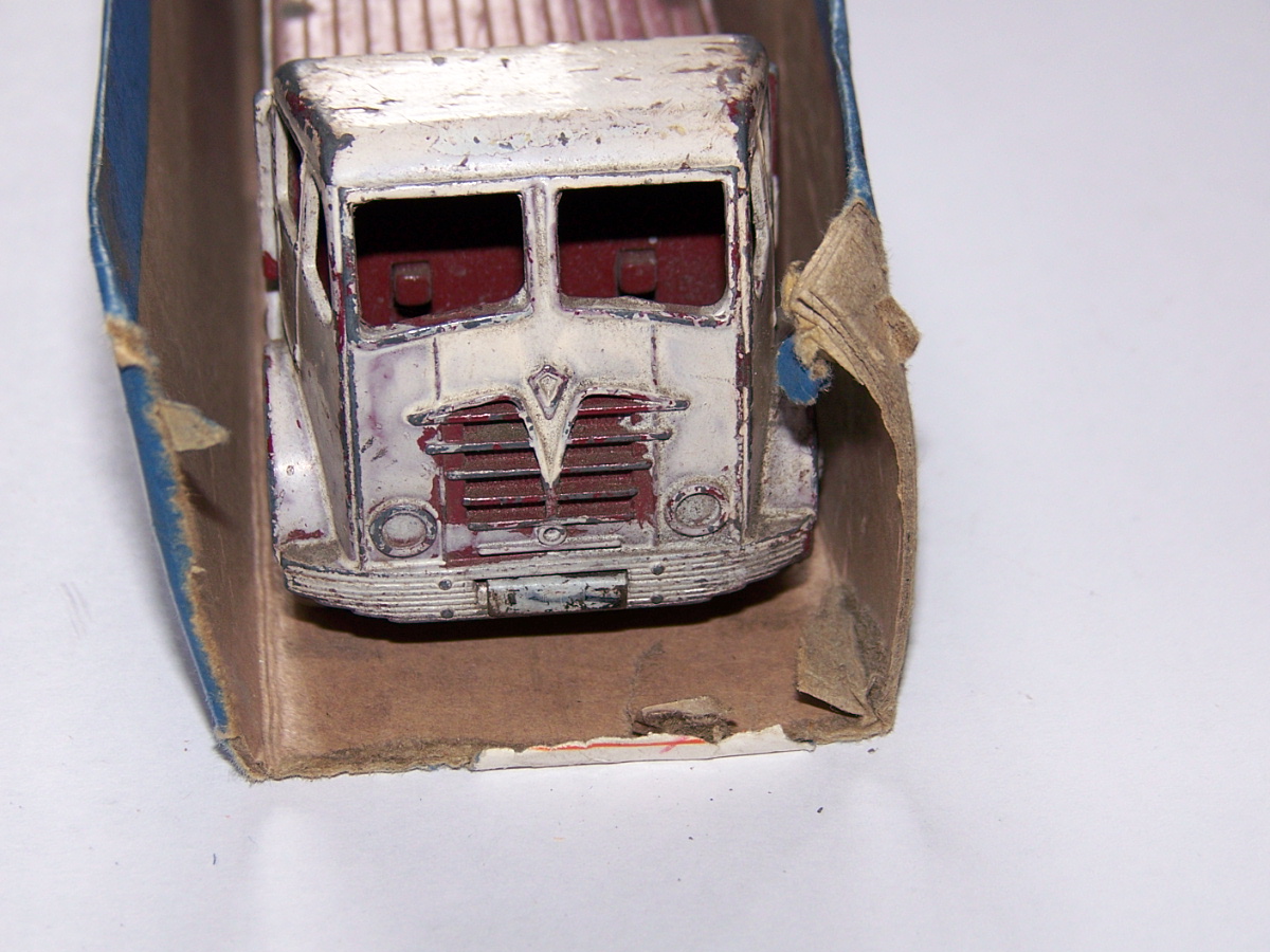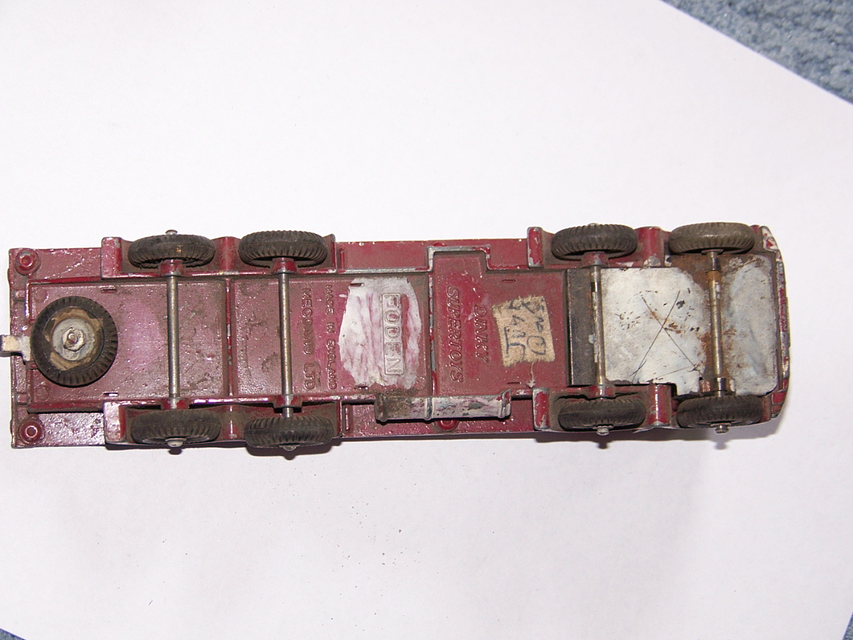 A dissappointing ebay purchase. The cab is glued to the bed, the second axle is glued to the chassis plate, no spare wheel. There was only one image to look at and I had no time to question the seller. Seller was at fault for not describing the model properly but I should have given it more time. So this becomes a new restoration project. First job was to strip the paint. I used aircraft paint stripper as this is quite powerful stuff and I was hoping that it would remove the epozy resin. Paint came off but not the epoxy. Next plan was to use heat and I used a heat gun, as you may use to strip paint. This worked perfectly, it destroyed the epoxy without further damage to the truck. All parts were cleaned and prepared for repair. The cab was reattached to the chassis using thin sheet metal and bonded with metal based epoxy resin. The wheel arches were repaired with metal resin and the bumper in a similar fashion but built up using several applications. The three chain posts that were not original we/images/101_3040.jpg)