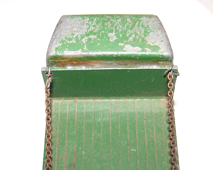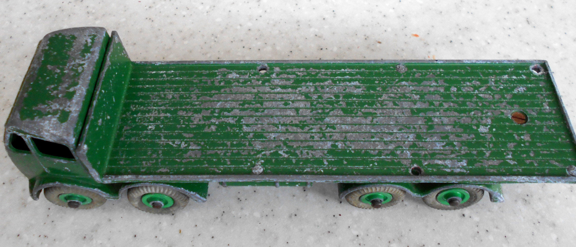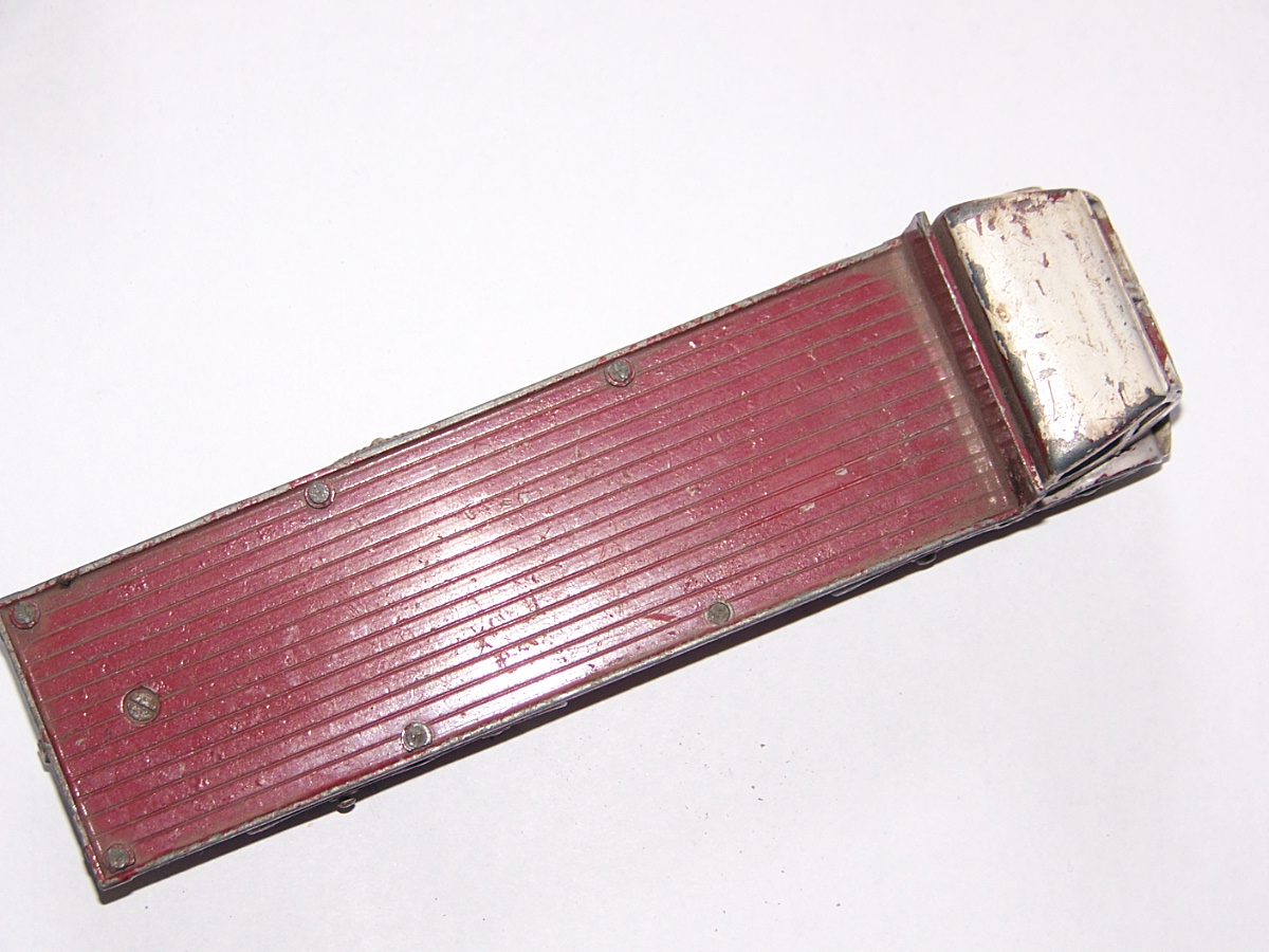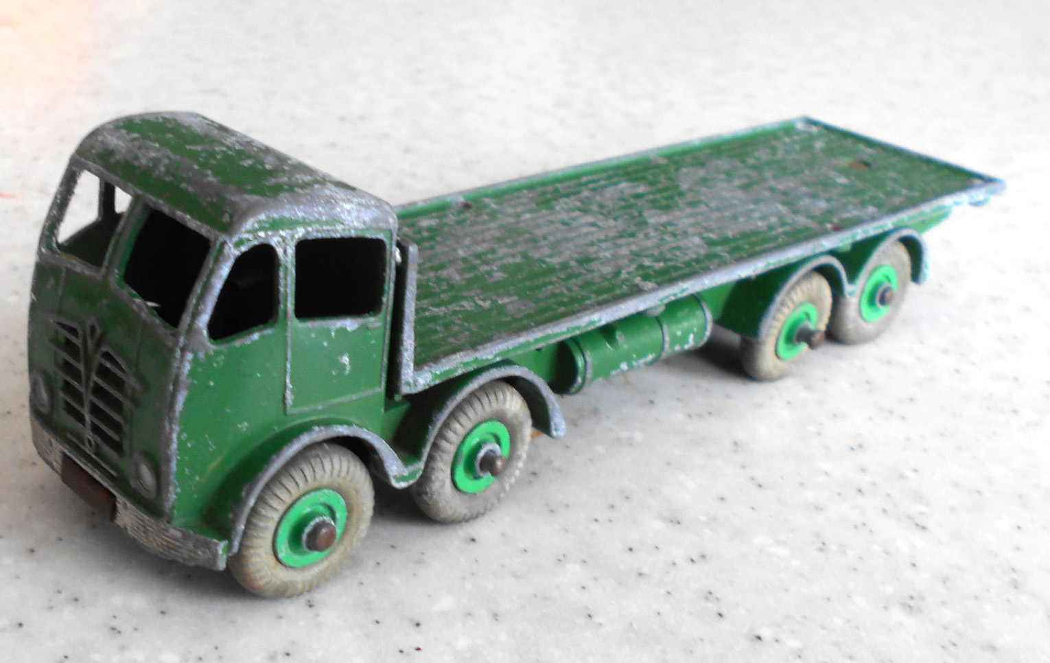 A dissappointing ebay purchase. The cab is glued to the bed, the second axle is glued to the chassis plate, no spare wheel. There was only one image to look at and I had no time to question the seller. Seller was at fault for not describing the model properly but I should have given it more time. So this becomes a new restoration project. First job was to strip the paint. I used aircraft paint stripper as this is quite powerful stuff and I was hoping that it would remove the epozy resin. Paint came off but not the epoxy. Next plan was to use heat and I used a heat gun, as you may use to strip paint. This worked perfectly, it destroyed the epoxy without further damage to the truck. All parts were cleaned and prepared for repair. The cab was reattached to the chassis using thin sheet metal and bonded with metal based epoxy resin. The wheel arches were repaired with metal resin and the bumper in a similar fashion but built up using several applications. The three chain posts that were not original we/images/101_3040.jpg)