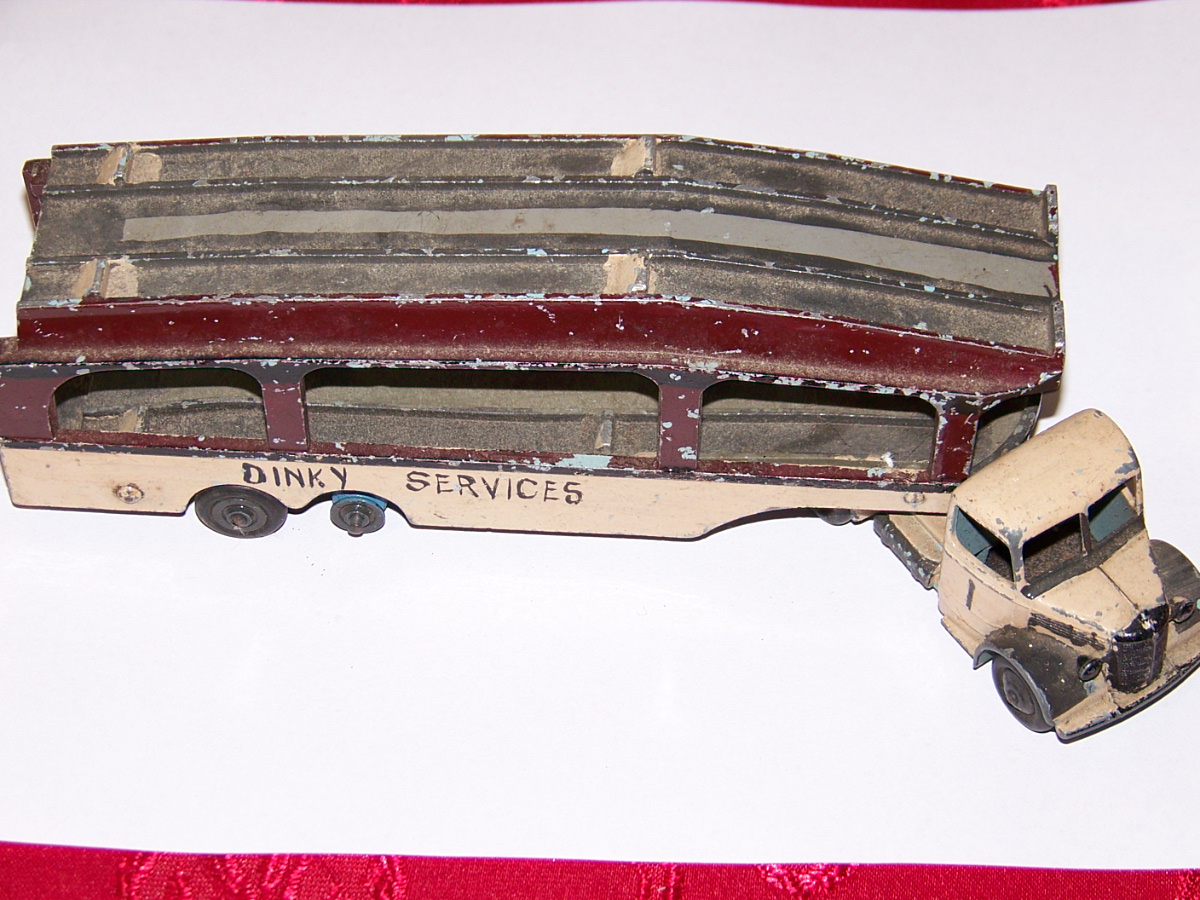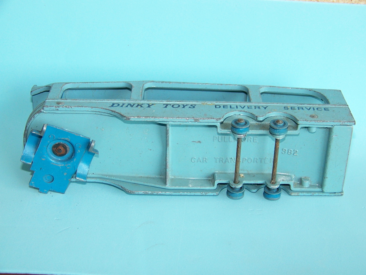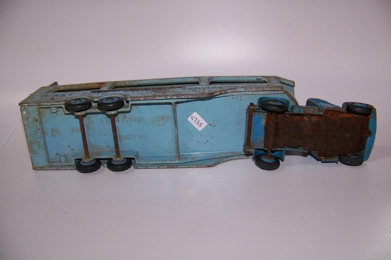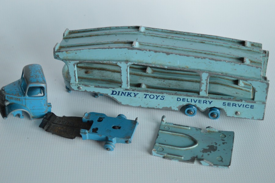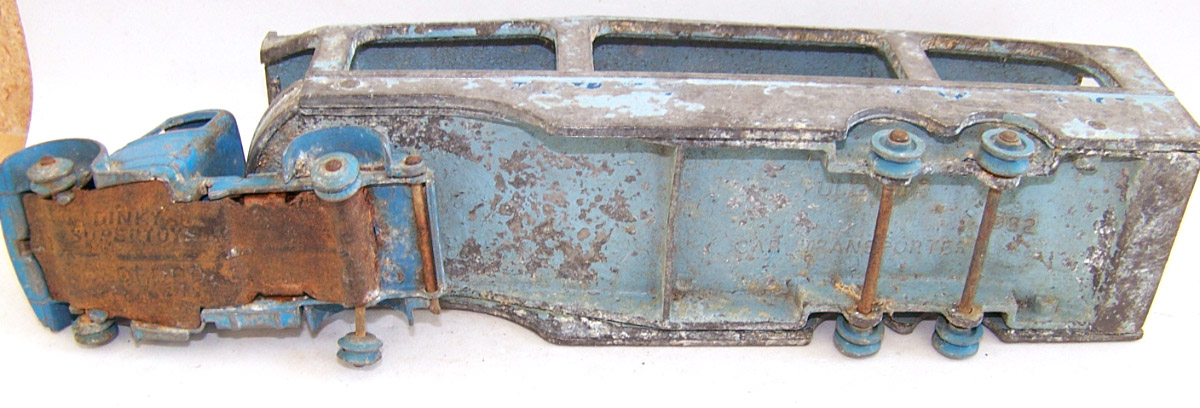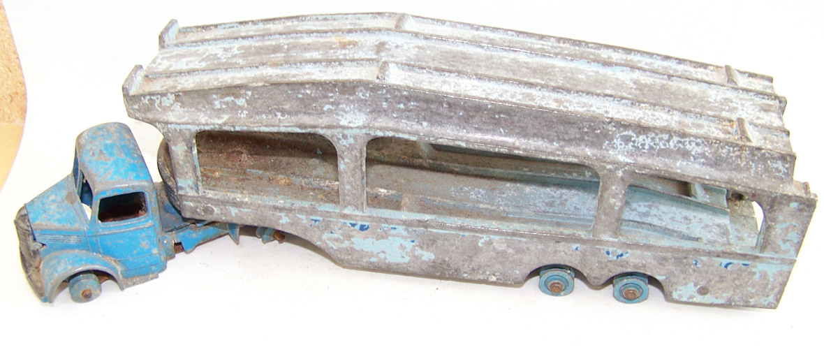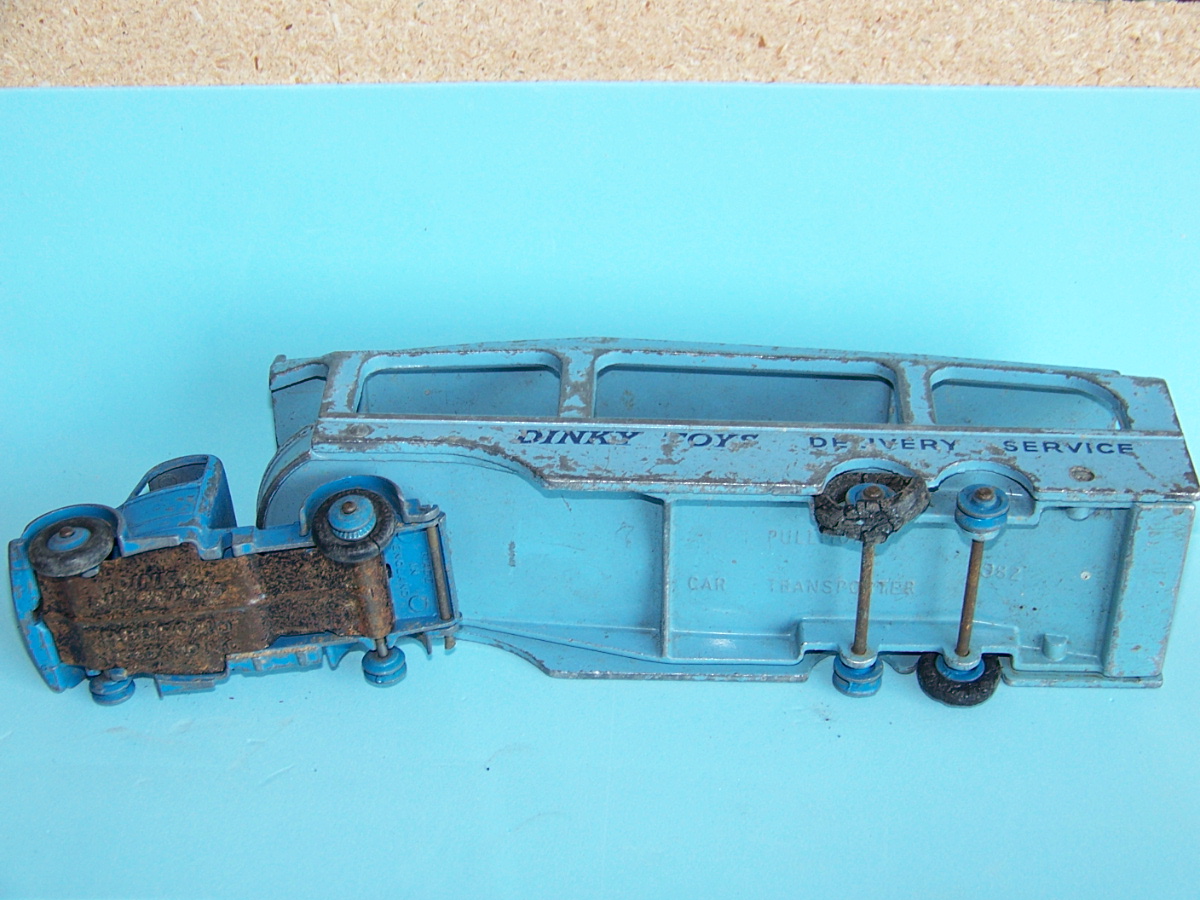A rough example and well worth restoring. Missing ramp, one headlight, bent axles, rusty chassis, and some corrosion, so not too much to do. Strip down could have been simpler as I assumed the rivets holding the upper trailer body to the lower were in fact rivets. I believe that they are studs in the lower part and the upper is opened up over them to assemble. This was a possible way to undo the parts but it may leave the upper part a little bent. The studs were drilled out using a 1/8th drill. I then drilled further to provide sockets for replacement studs. The cab unit was separated by grinding the rivet top off from the lower unit and punching out. The grille tabs were ground off the grille to remove it from the cab. The chassis was removed by easing back the tabs and gently pulling out. All axles were removed with wheels. The body and chassis parts were sandblasted and cleaned with wire wool prior to priming. Two coats of primer was used to provide a good flat base for the top coats. Now/images/101_6425.jpg)