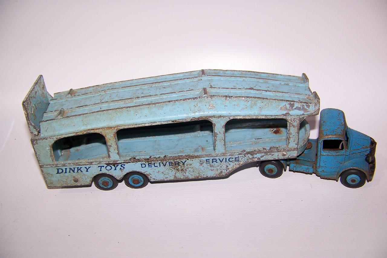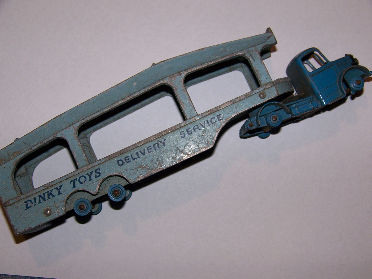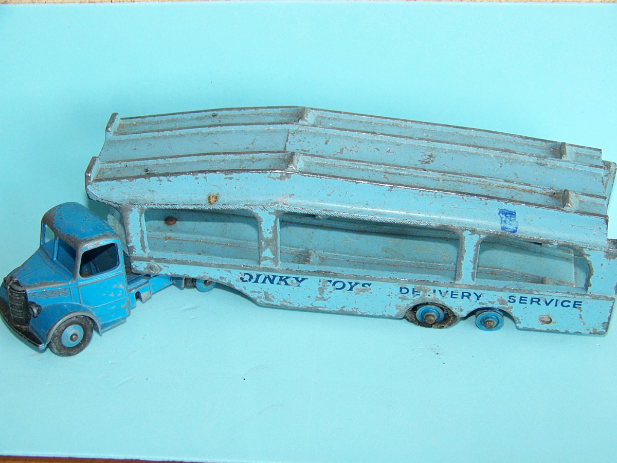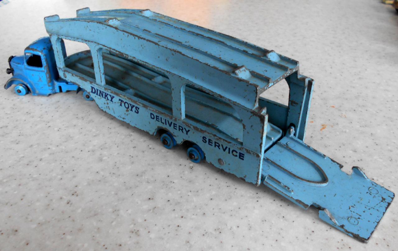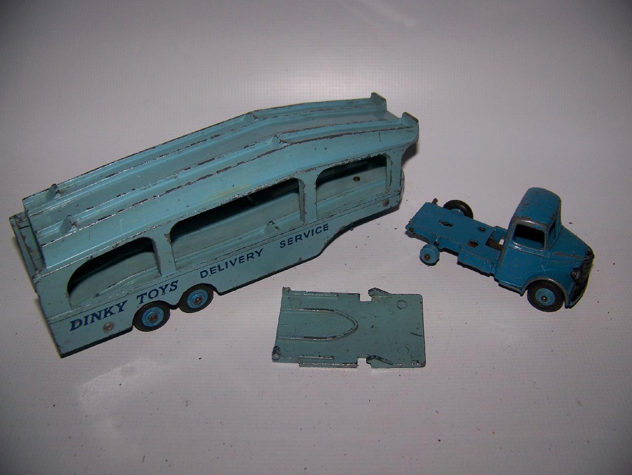 A rough example and well worth restoring. Missing ramp, one headlight, bent axles, rusty chassis, and some corrosion, so not too much to do. Strip down could have been simpler as I assumed the rivets holding the upper trailer body to the lower were in fact rivets. I believe that they are studs in the lower part and the upper is opened up over them to assemble. This was a possible way to undo the parts but it may leave the upper part a little bent. The studs were drilled out using a 1/8th drill. I then drilled further to provide sockets for replacement studs. The cab unit was separated by grinding the rivet top off from the lower unit and punching out. The grille tabs were ground off the grille to remove it from the cab. The chassis was removed by easing back the tabs and gently pulling out. All axles were removed with wheels. The body and chassis parts were sandblasted and cleaned with wire wool prior to priming. Two coats of primer was used to provide a good flat base for the top coats. Now/images/101_6425.jpg)