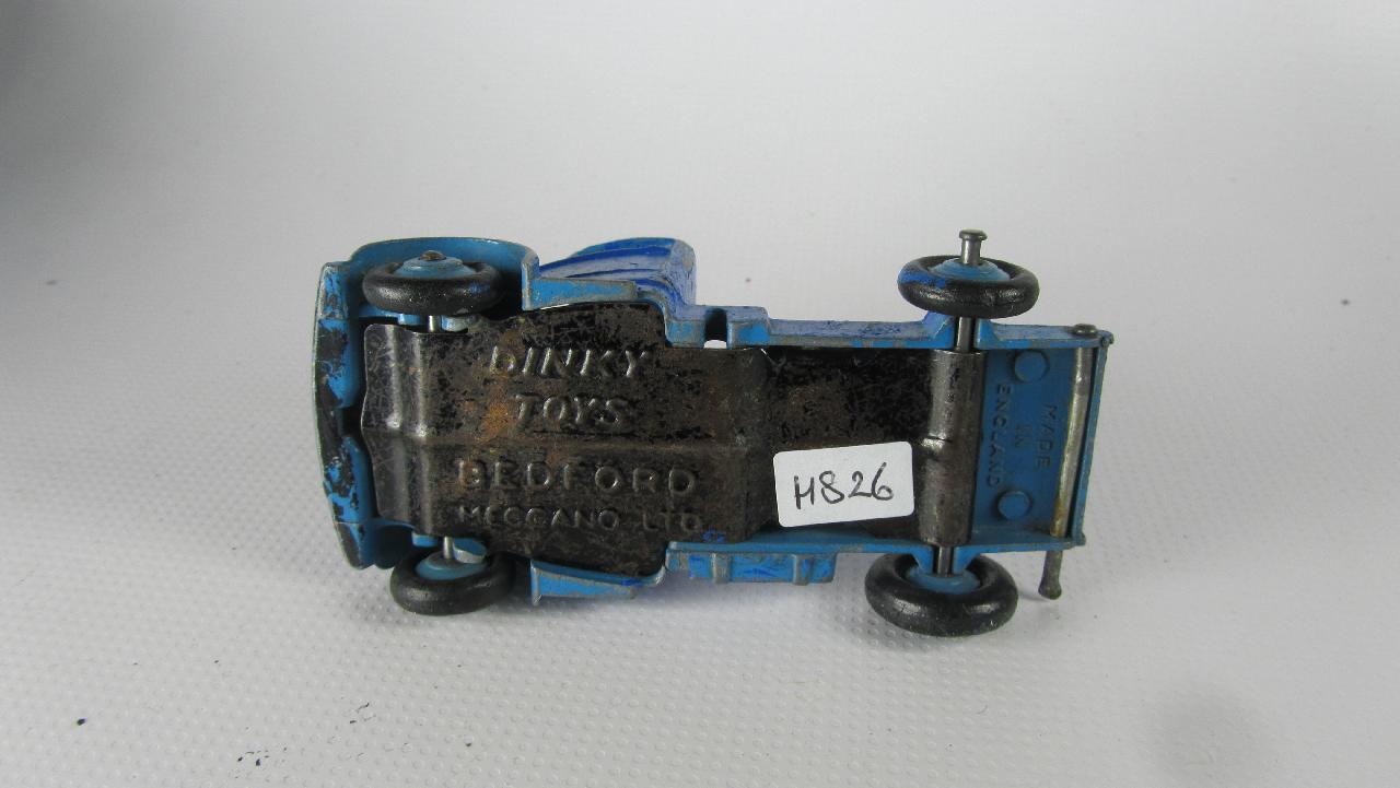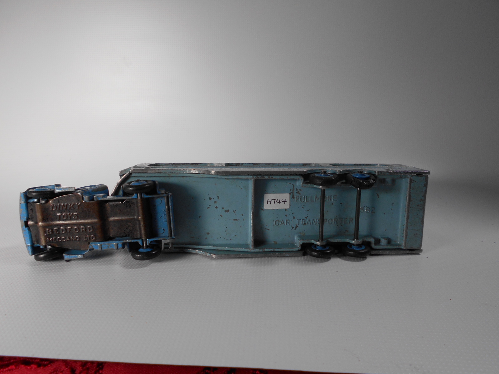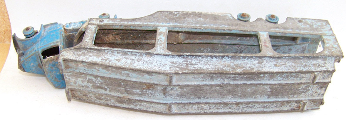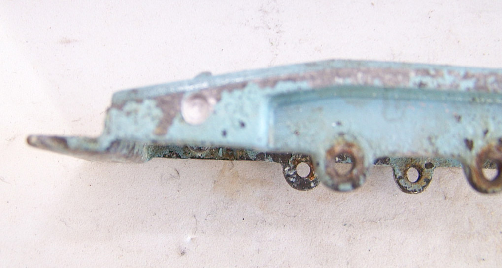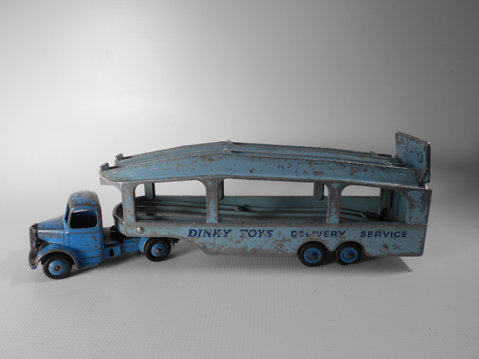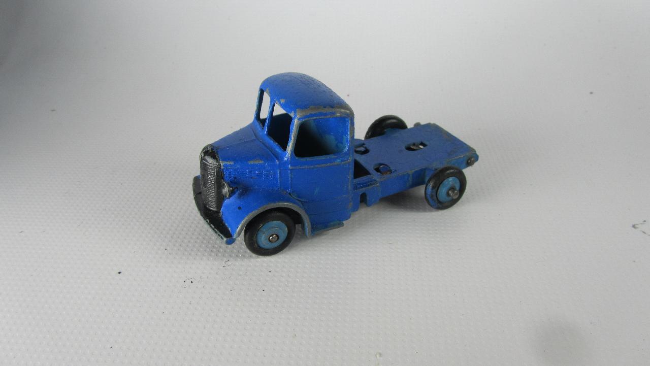 A rough example and well worth restoring. Missing ramp, one headlight, bent axles, rusty chassis, and some corrosion, so not too much to do. Strip down could have been simpler as I assumed the rivets holding the upper trailer body to the lower were in fact rivets. I believe that they are studs in the lower part and the upper is opened up over them to assemble. This was a possible way to undo the parts but it may leave the upper part a little bent. The studs were drilled out using a 1/8th drill. I then drilled further to provide sockets for replacement studs. The cab unit was separated by grinding the rivet top off from the lower unit and punching out. The grille tabs were ground off the grille to remove it from the cab. The chassis was removed by easing back the tabs and gently pulling out. All axles were removed with wheels. The body and chassis parts were sandblasted and cleaned with wire wool prior to priming. Two coats of primer was used to provide a good flat base for the top coats. Now/images/101_6425.jpg)