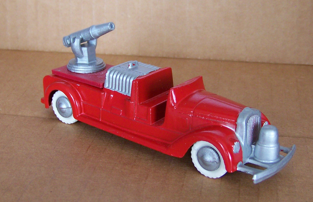 One wonders if restoration is worth it. It is only a Tootsietoy. Well I will have a go and made it worthwhile. Strip and respray without a problem. I created a 3D pump on a swivel, not an exact match but look good. The original did not cover the ladder holes so I created a base to cover them.